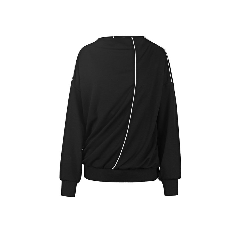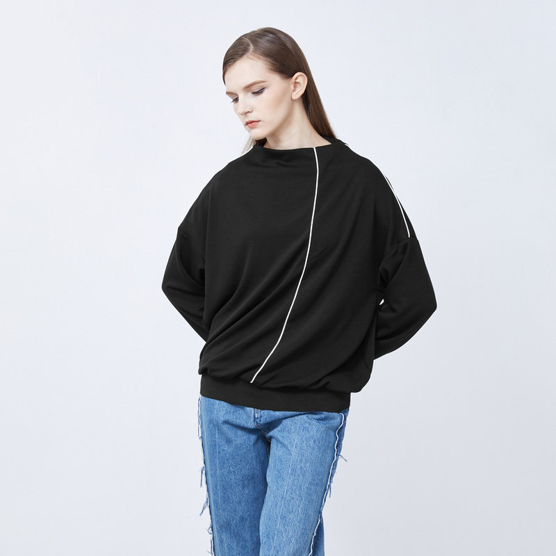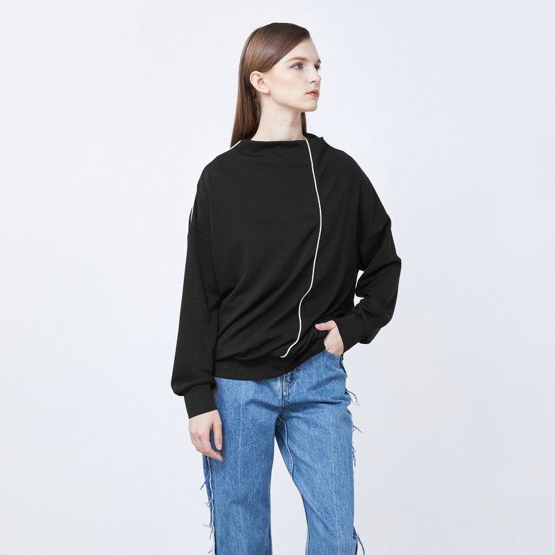 sdeer圣迪奥女装一字领撞色线条罗纹黑色长袖T恤S21480206