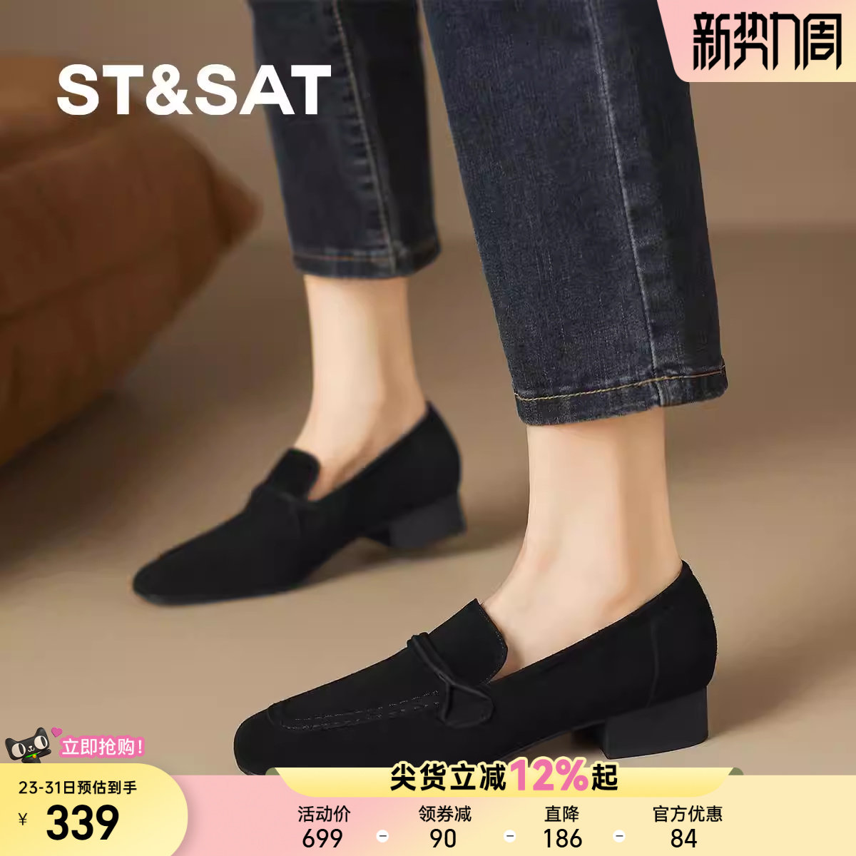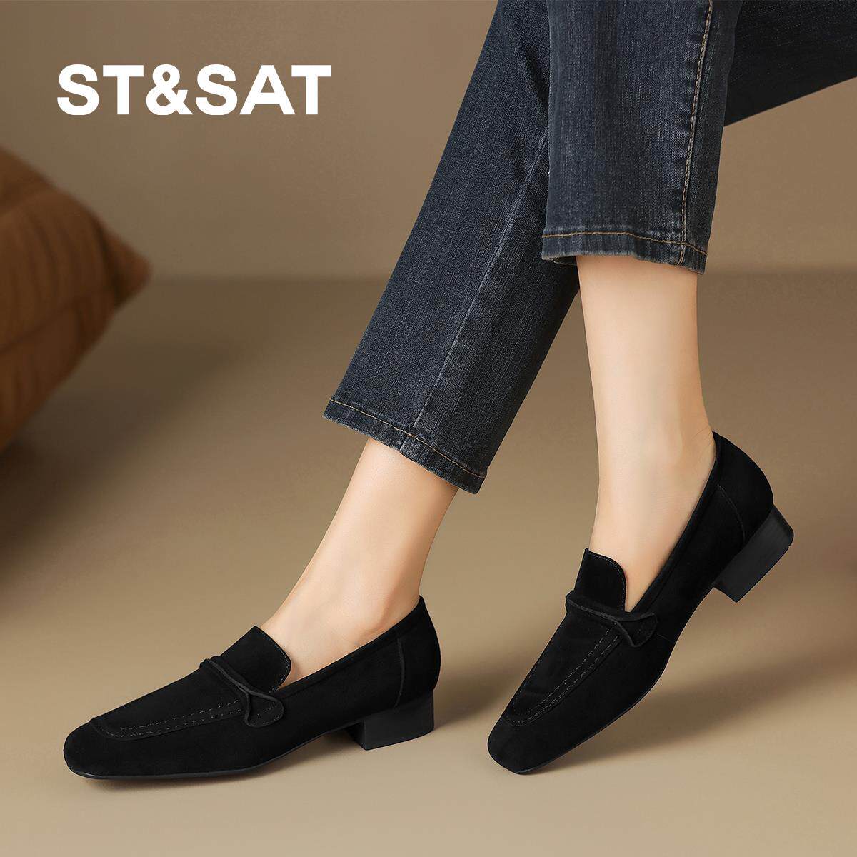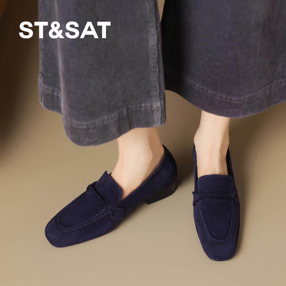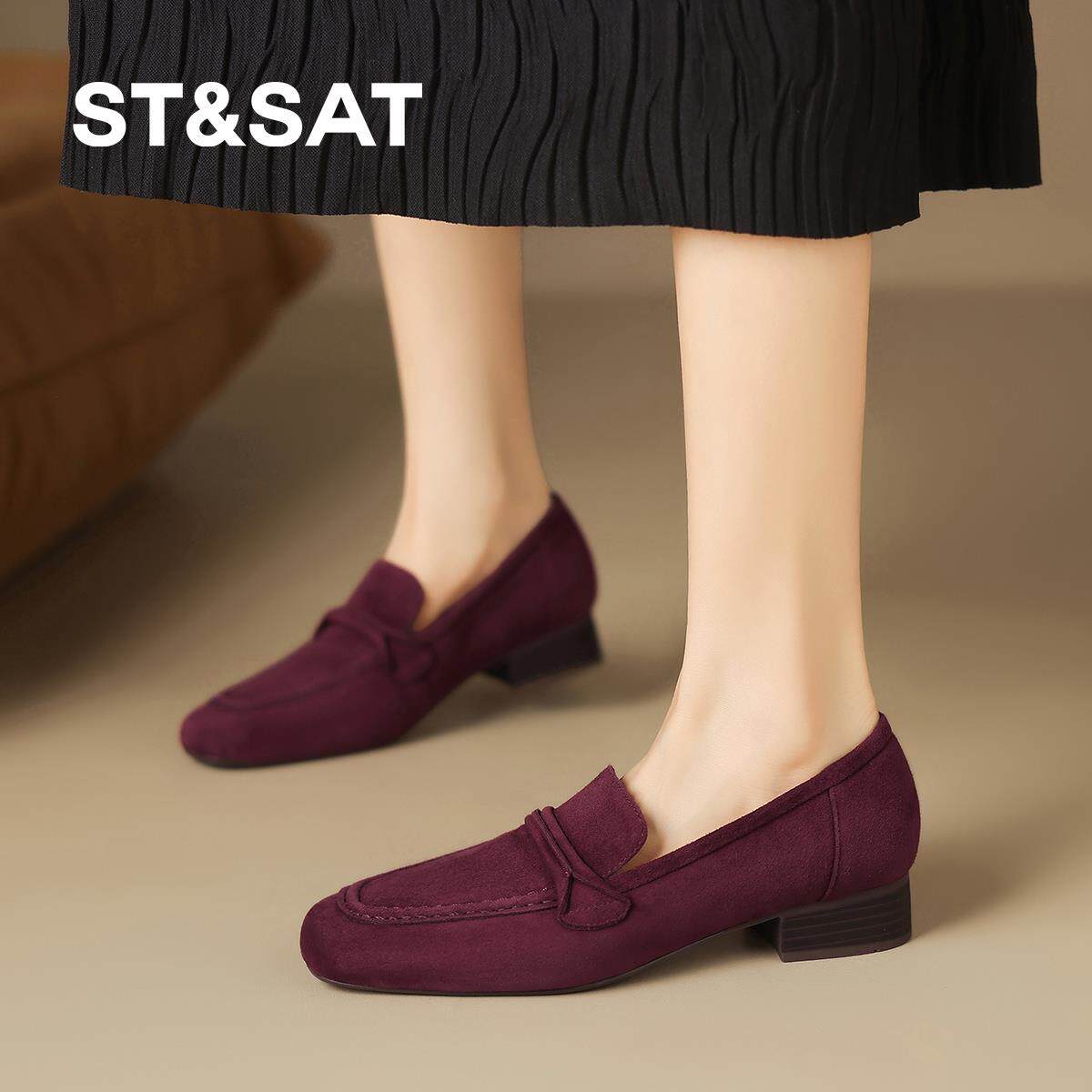 星期六2025新款法式复古方头粗跟乐福鞋女懒人一脚蹬绒面女单鞋