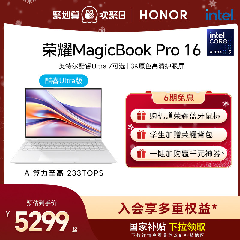 【政府补贴20%】HONOR/荣耀MagicBook Pro 16 英特尔酷睿Ultra5 16英寸AI PC轻薄游戏本笔记本电脑空间音频