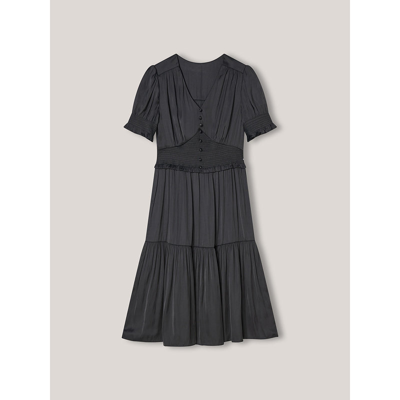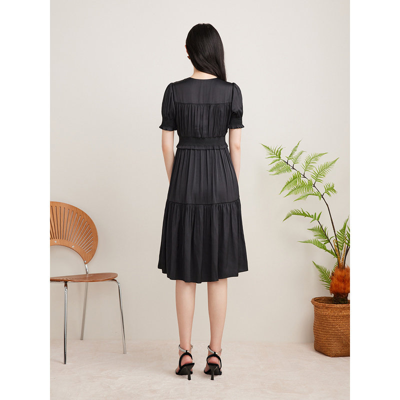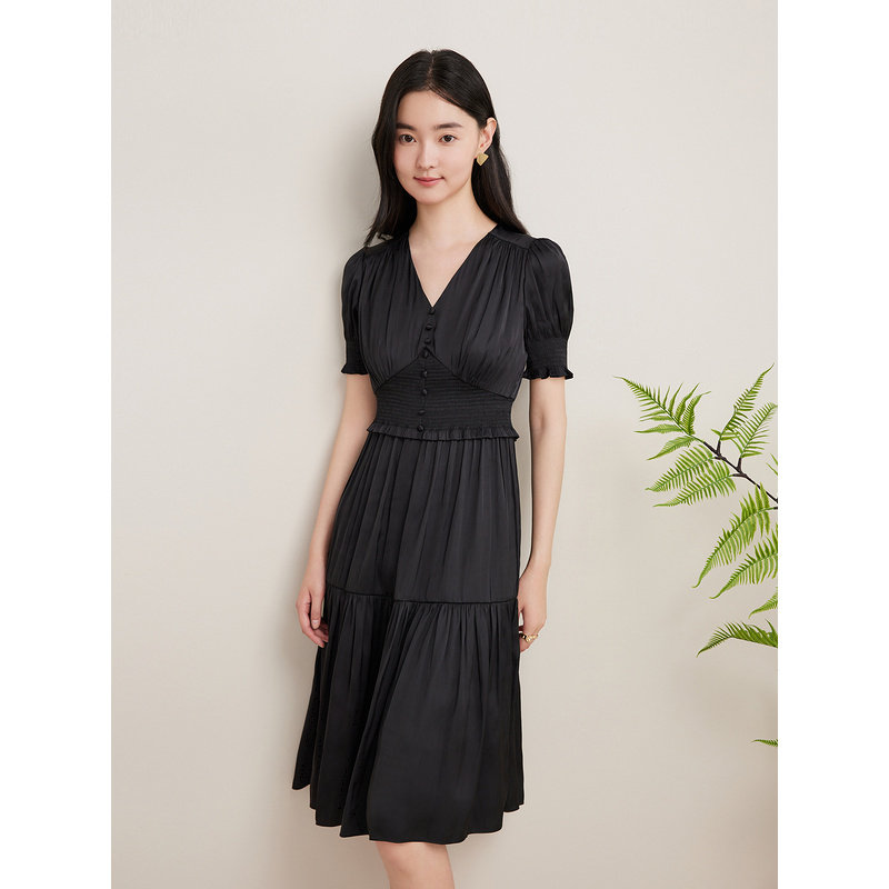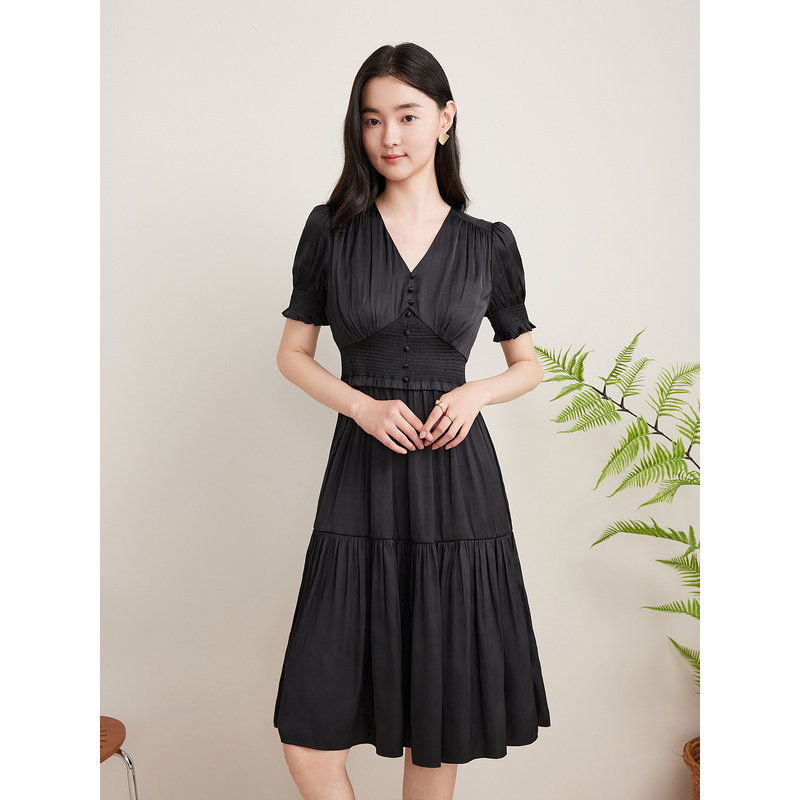Goodland美地夏季V领小黑裙高腰收褶收腰连衣裙