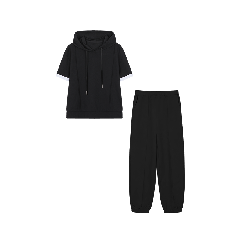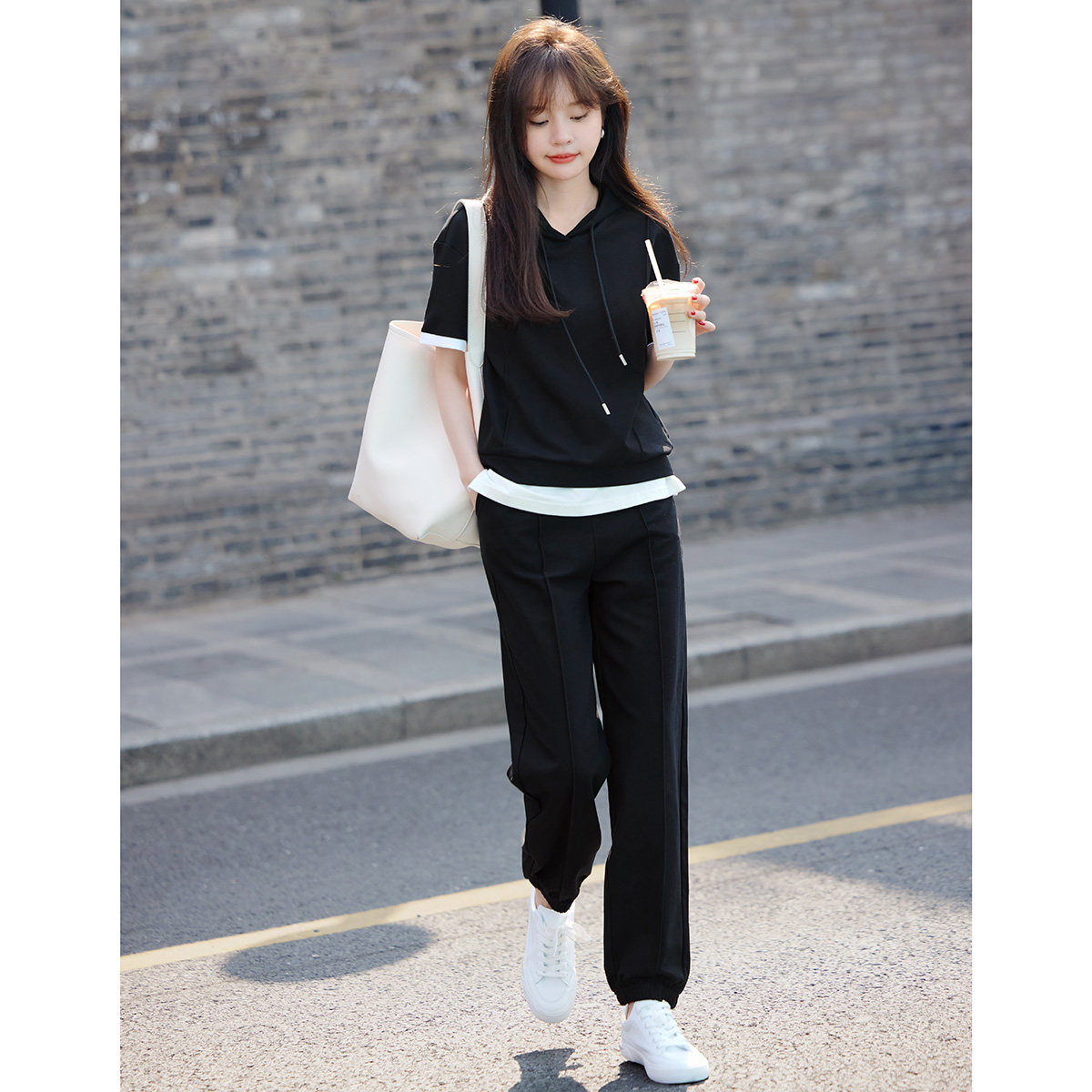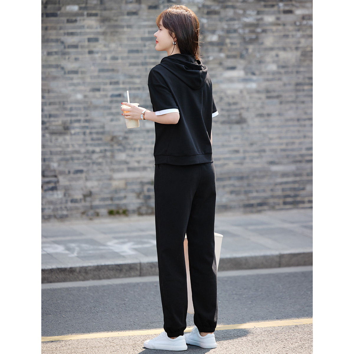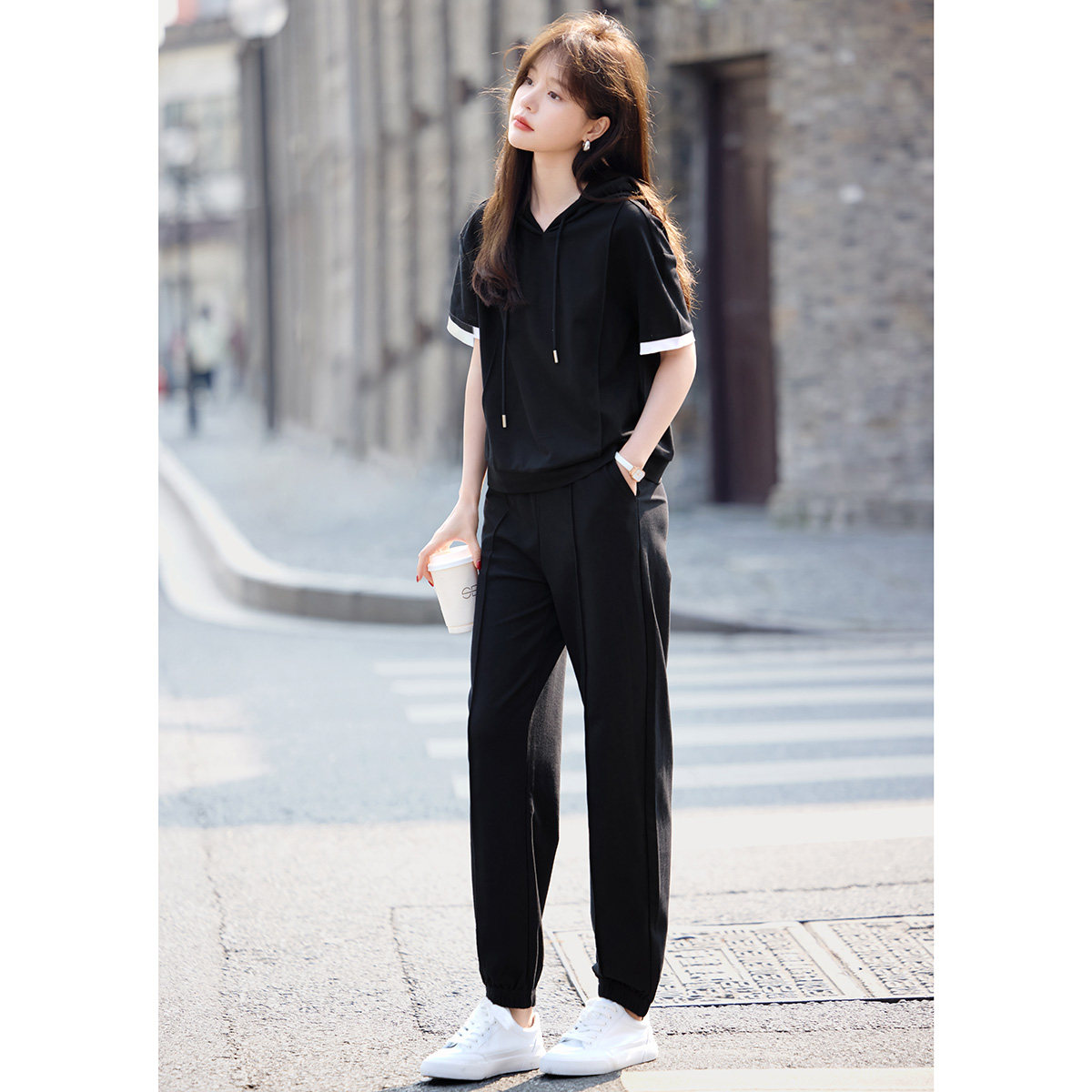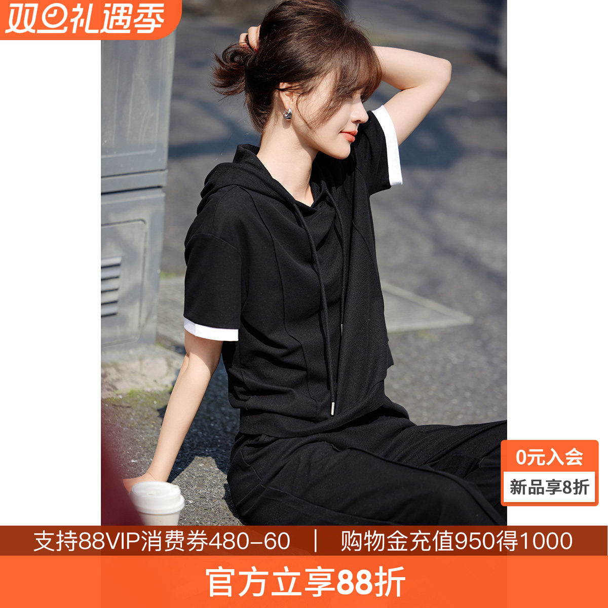 沫晗依美短袖休闲运动套装2025夏季新款连帽直筒裤两件套时尚套装