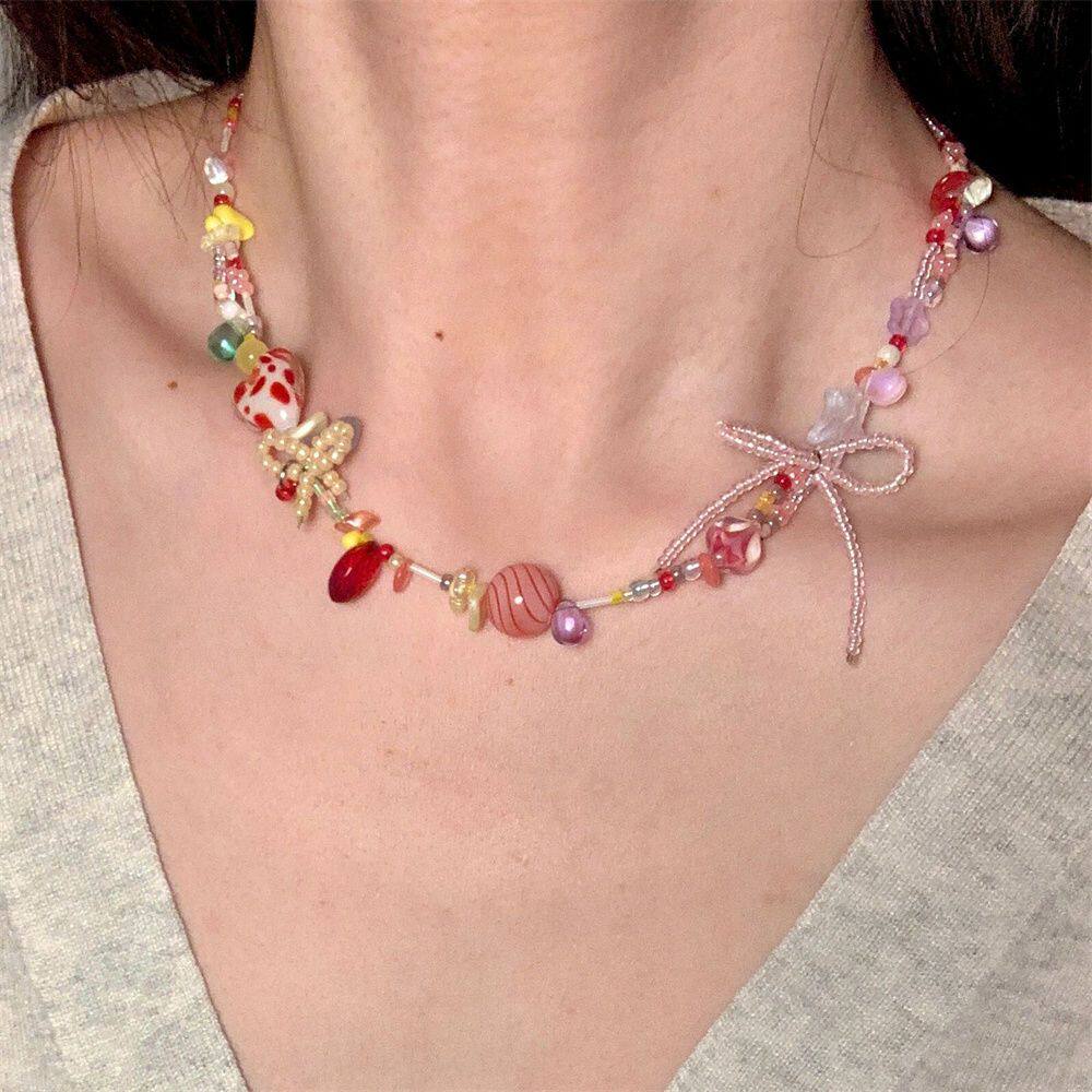 苹果味的糖果乐园~y2k彩色多巴胺糖果色串珠项链夏天配饰蝴蝶锁骨