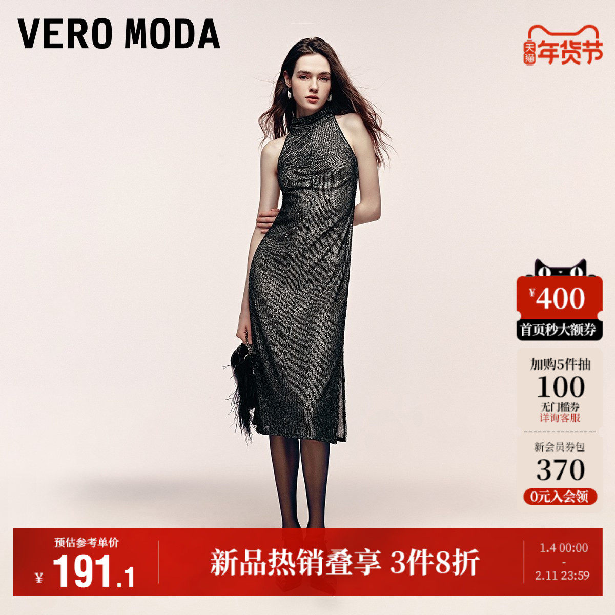 Vero Moda奥莱连衣裙秋冬新款A字挂脖内衬网纱亮片性感女人流行