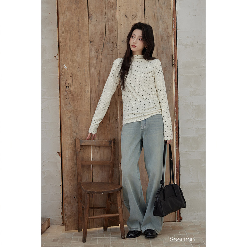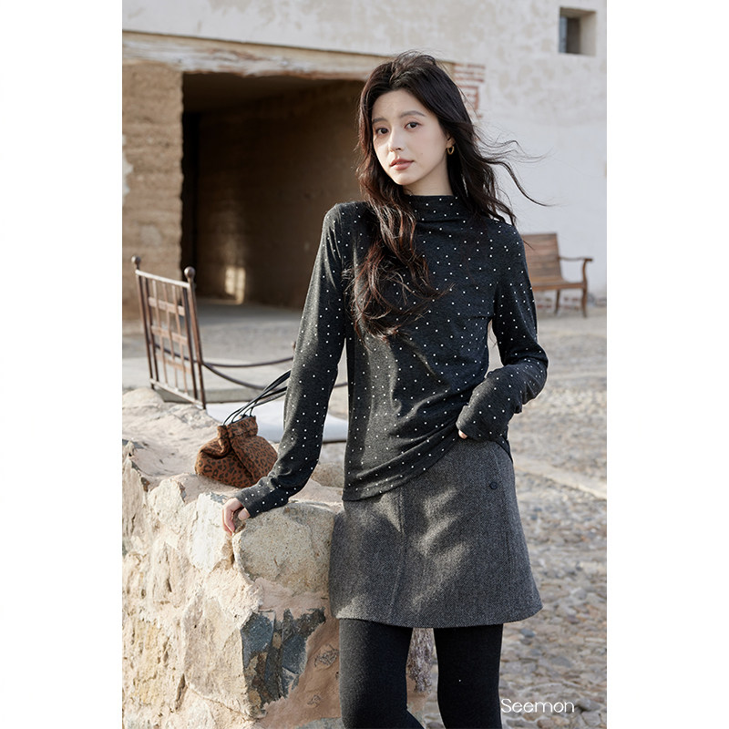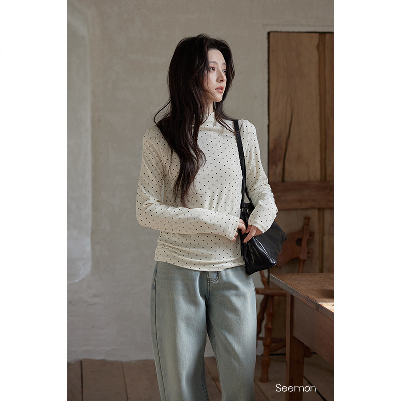 夕蒙2025新款冬季半高领打底衫上衣独特漂亮高级感小个子波点t恤