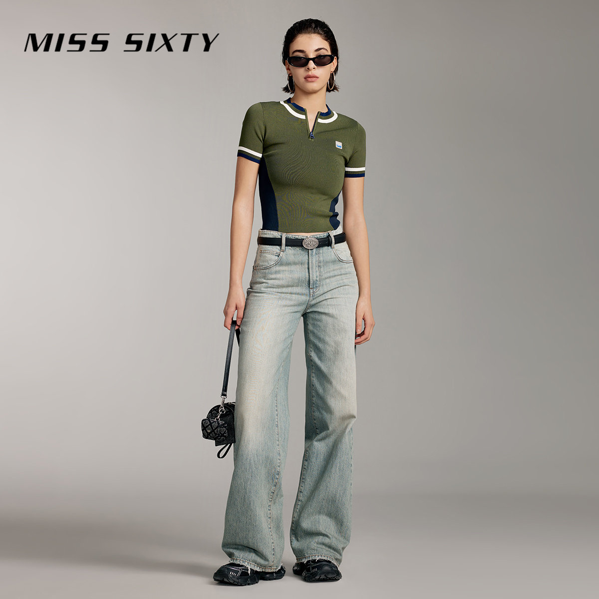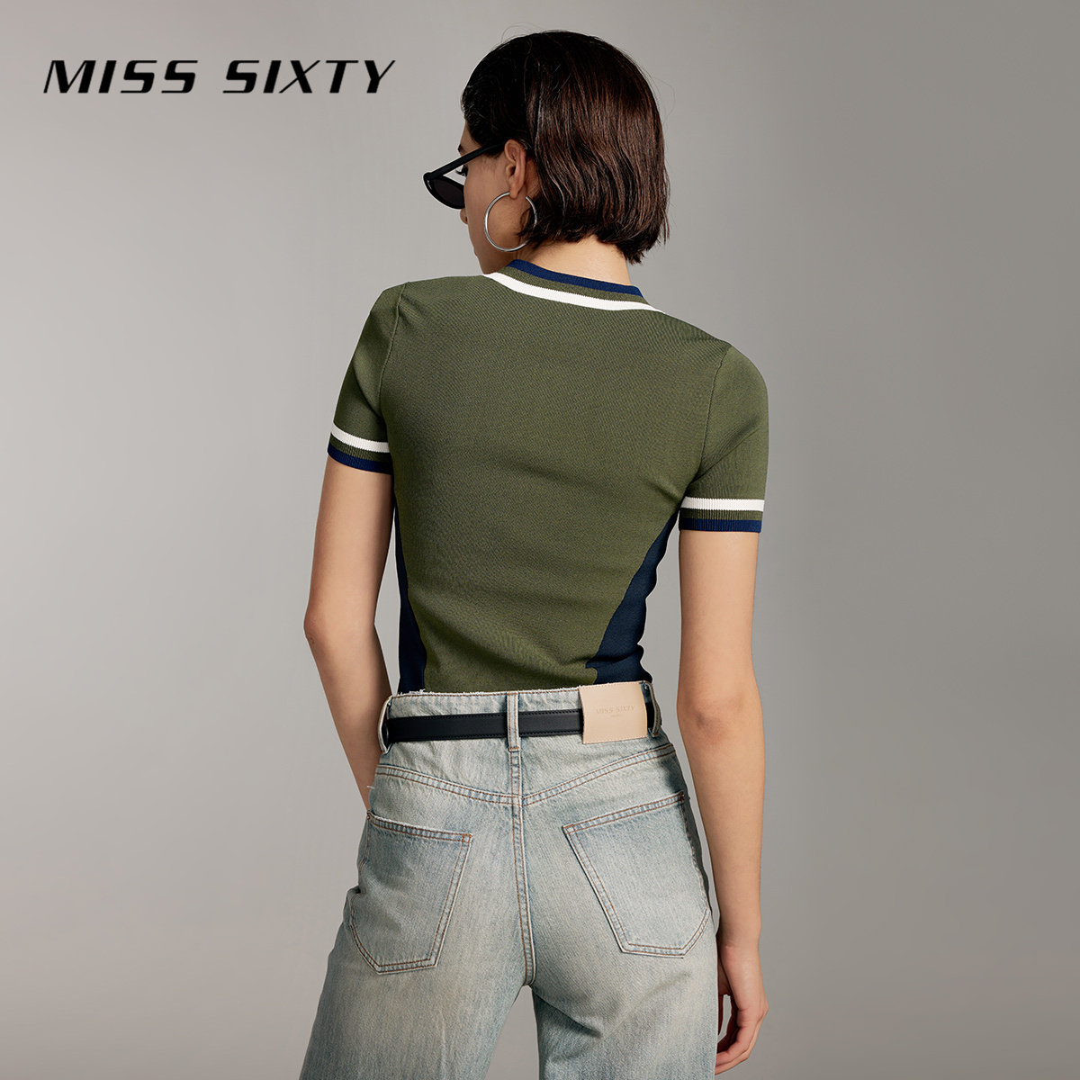Miss Sixty针织衫上衣女圆领短袖撞色拼接条纹美式复古休闲运动风