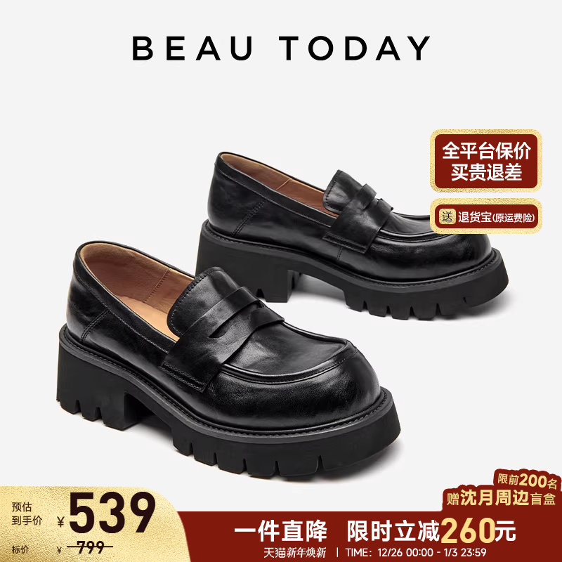 BeauToday厚底乐福鞋女2025新款黑色粗跟单鞋BT真皮英伦风小皮鞋