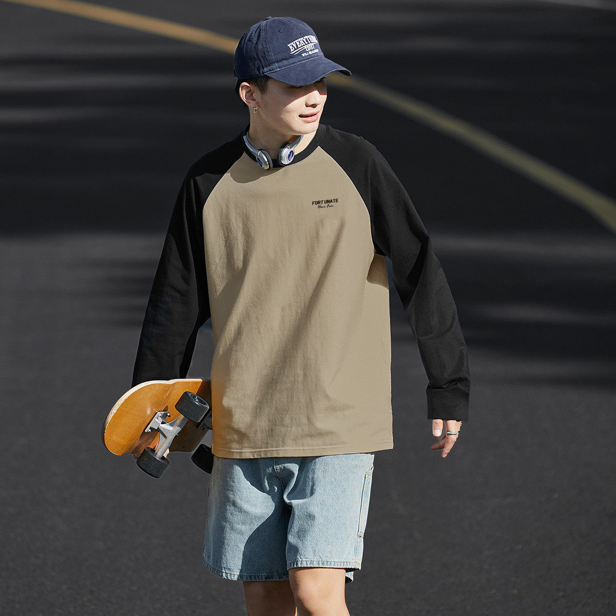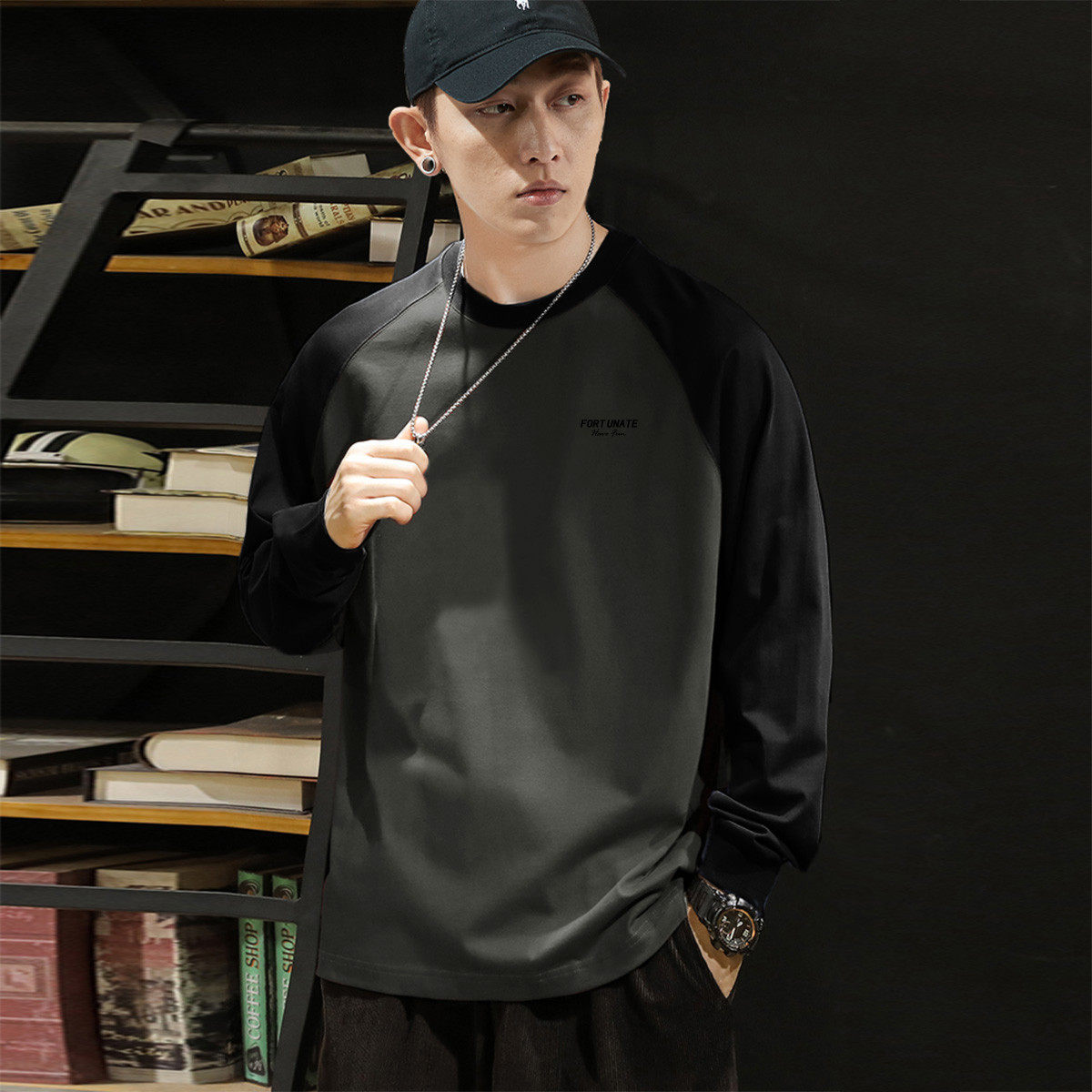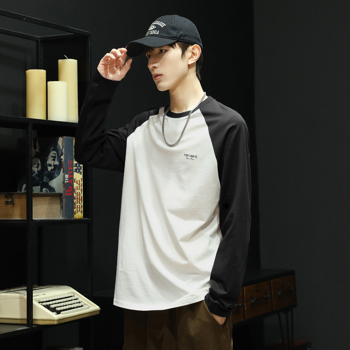 唐狮秋季新款长袖T恤男插肩白色宽松内搭青少年纯棉打底衫潮TD