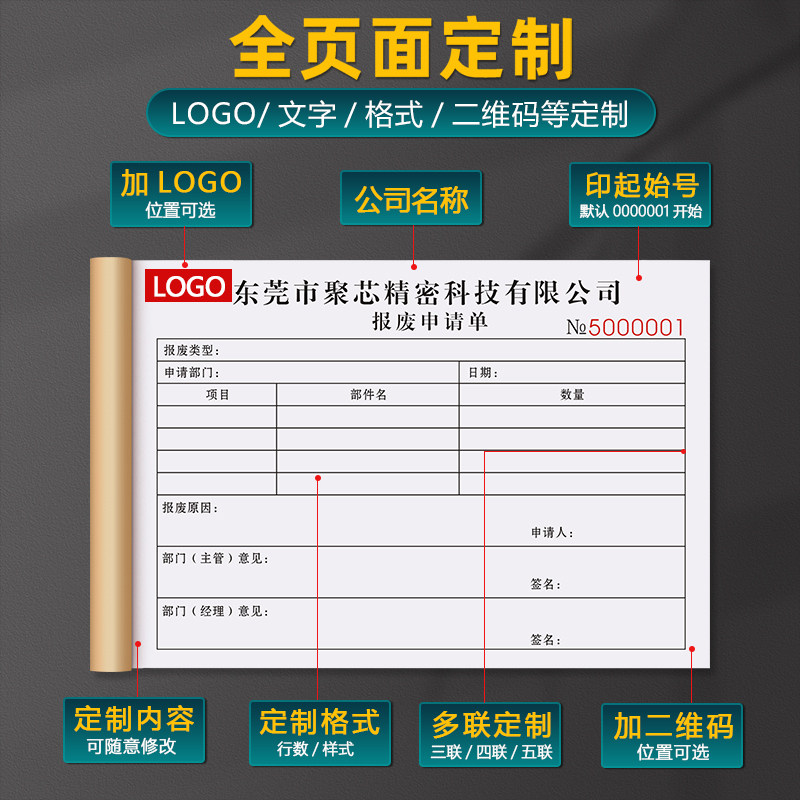 【报废专用申请单】生产物料领料单二联车间不合格退料换料单据工厂物品报损补料表三联仓库不良品处理通知单