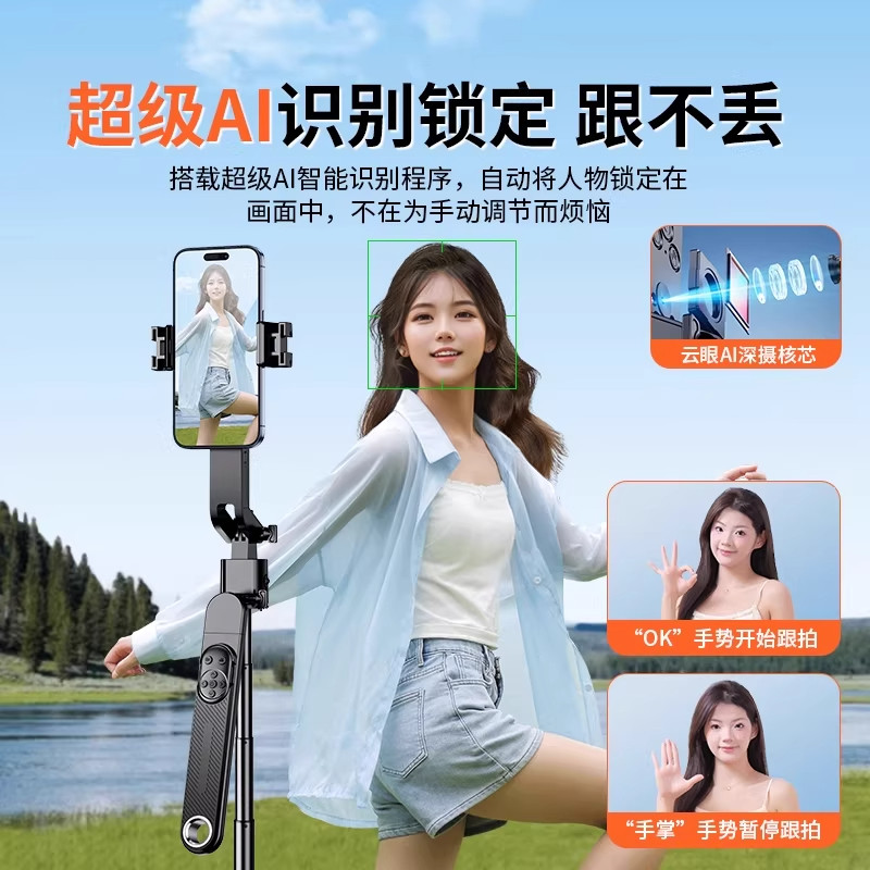 AI跟拍自拍杆直播支架云台2025新款360度旋转自拍神器手机通用自动拍摄稳定器旅游便携落地三脚架4防抖抖音