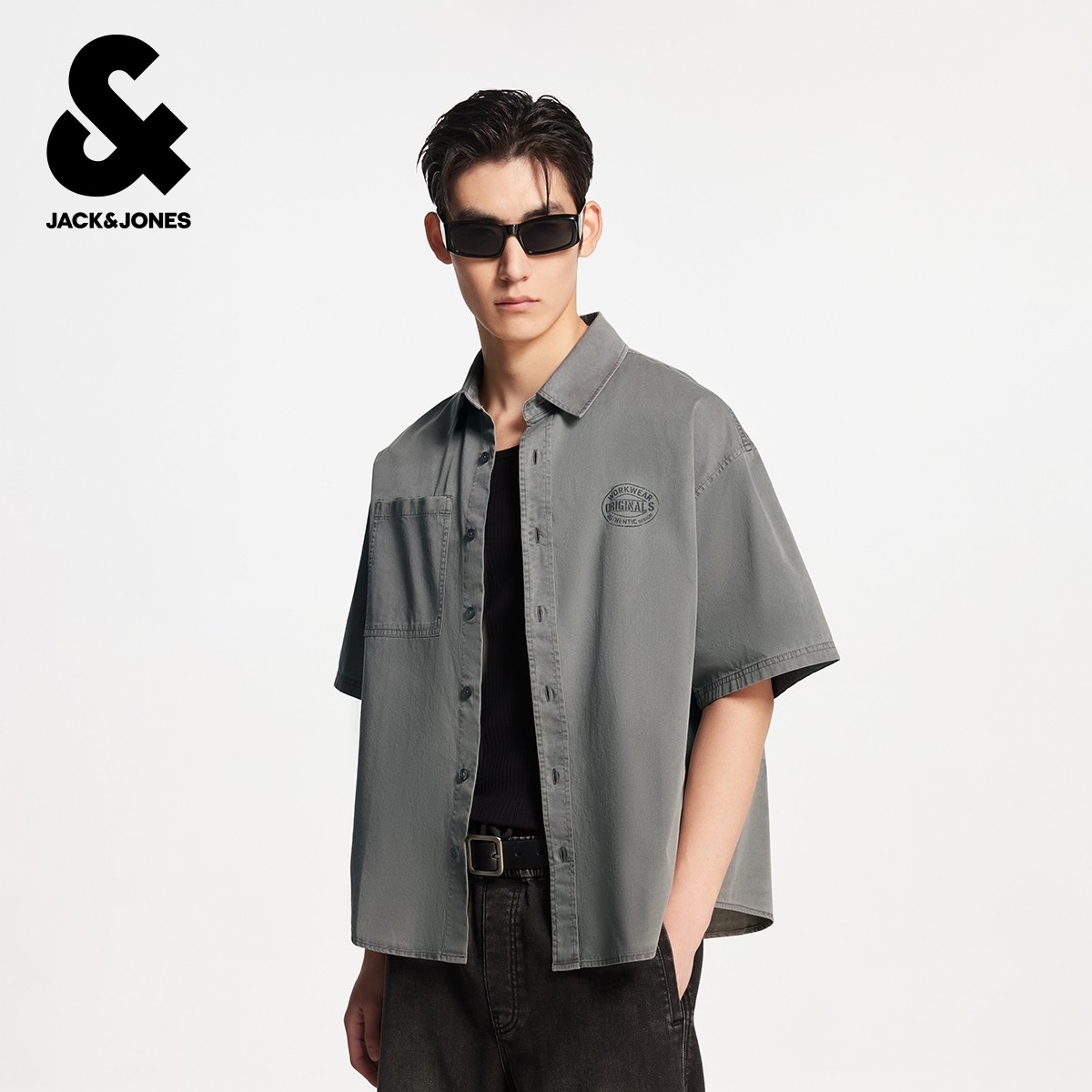 杰克琼斯男装秋季新款纯棉舒适字母胶印日常休闲翻领宽松短袖衬衫