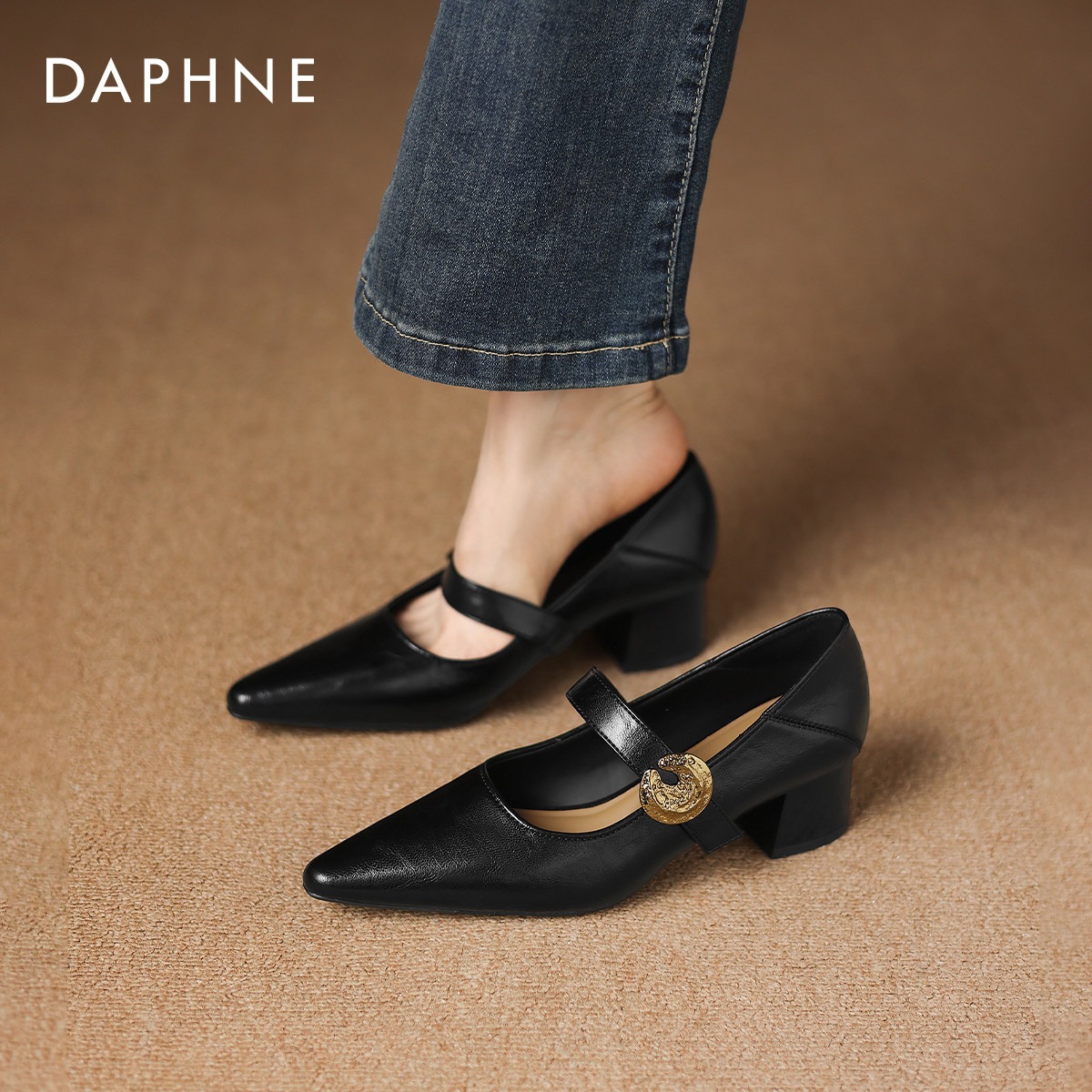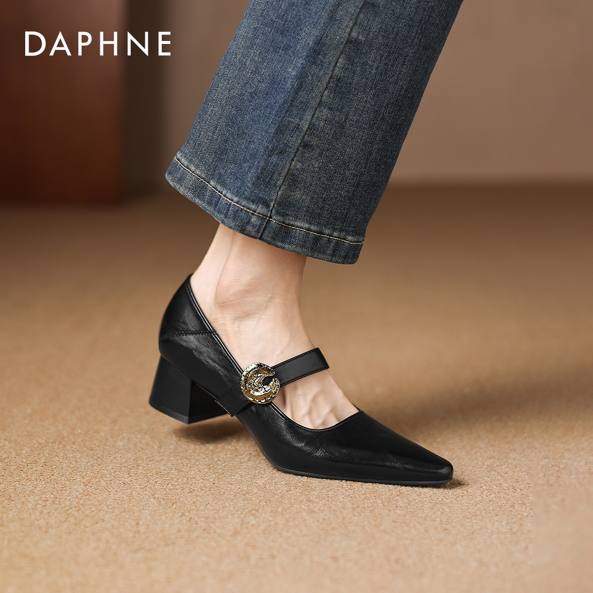 达芙妮尖头单鞋女2026新款一字扣通勤高级感小皮鞋子粗跟玛丽珍鞋