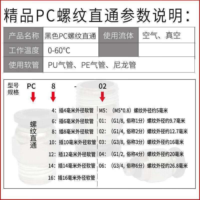 贝傅特气动快速接头气动元件黑色精品气动气管快插快速接头PC4-M3