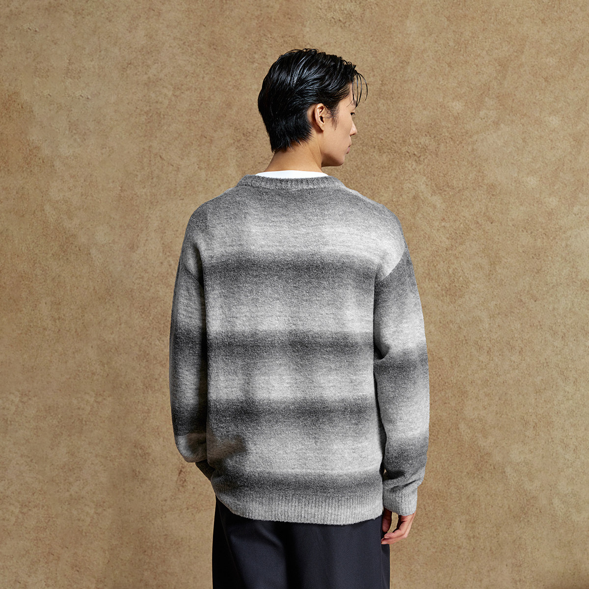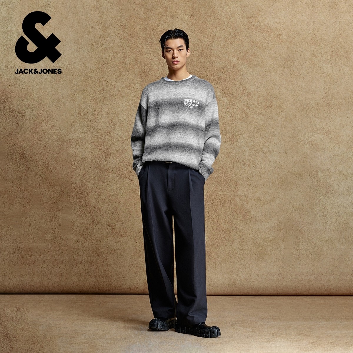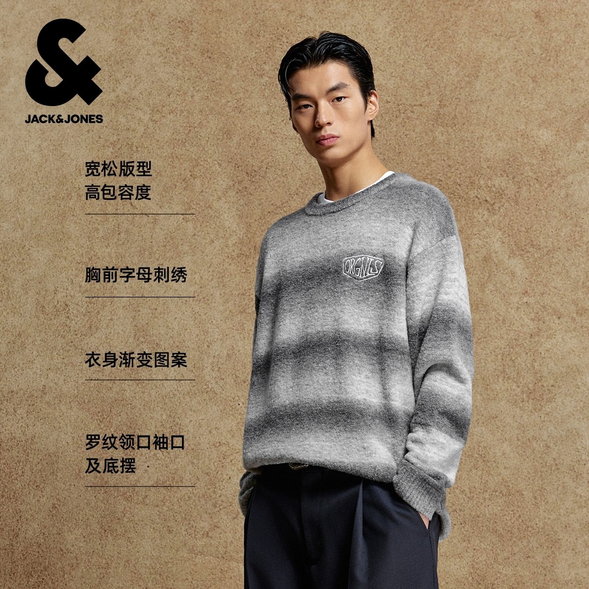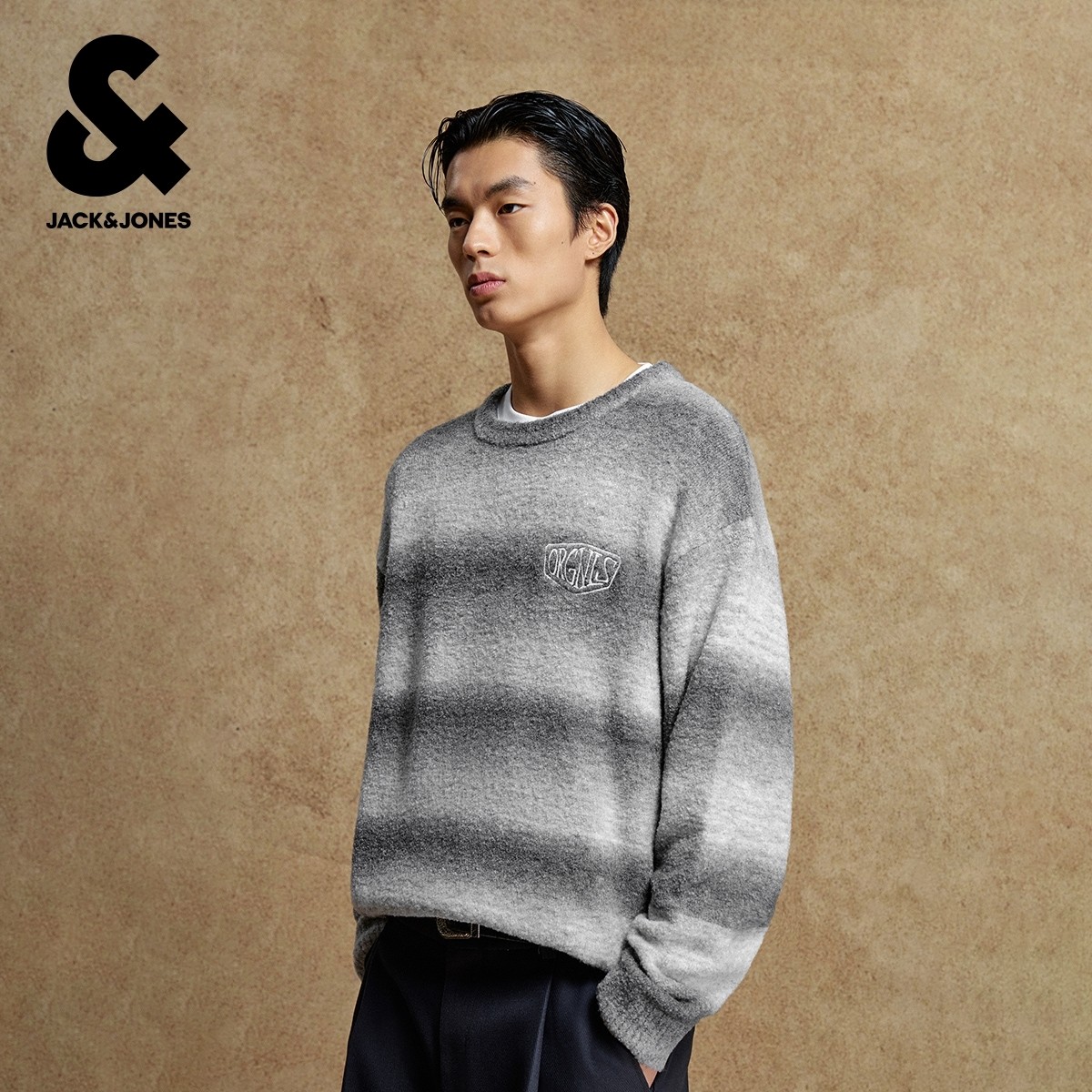 [羊毛混纺/纯棉]杰克琼斯男装秋新款条纹渐变宽松毛衣刺绣针织衫