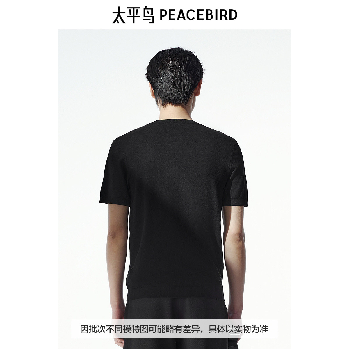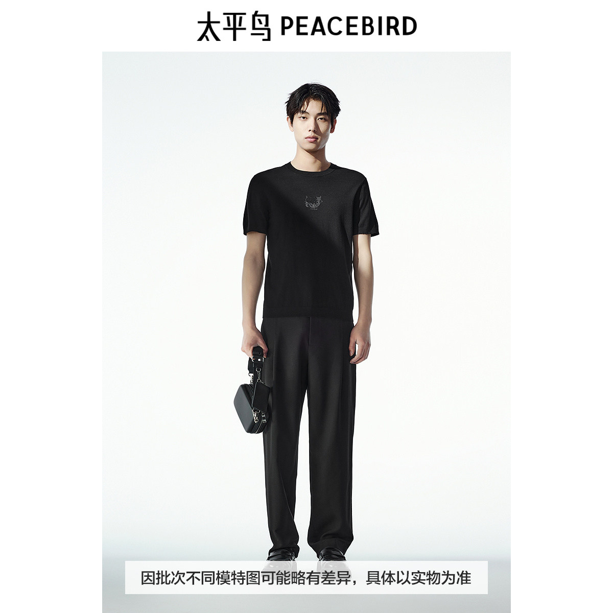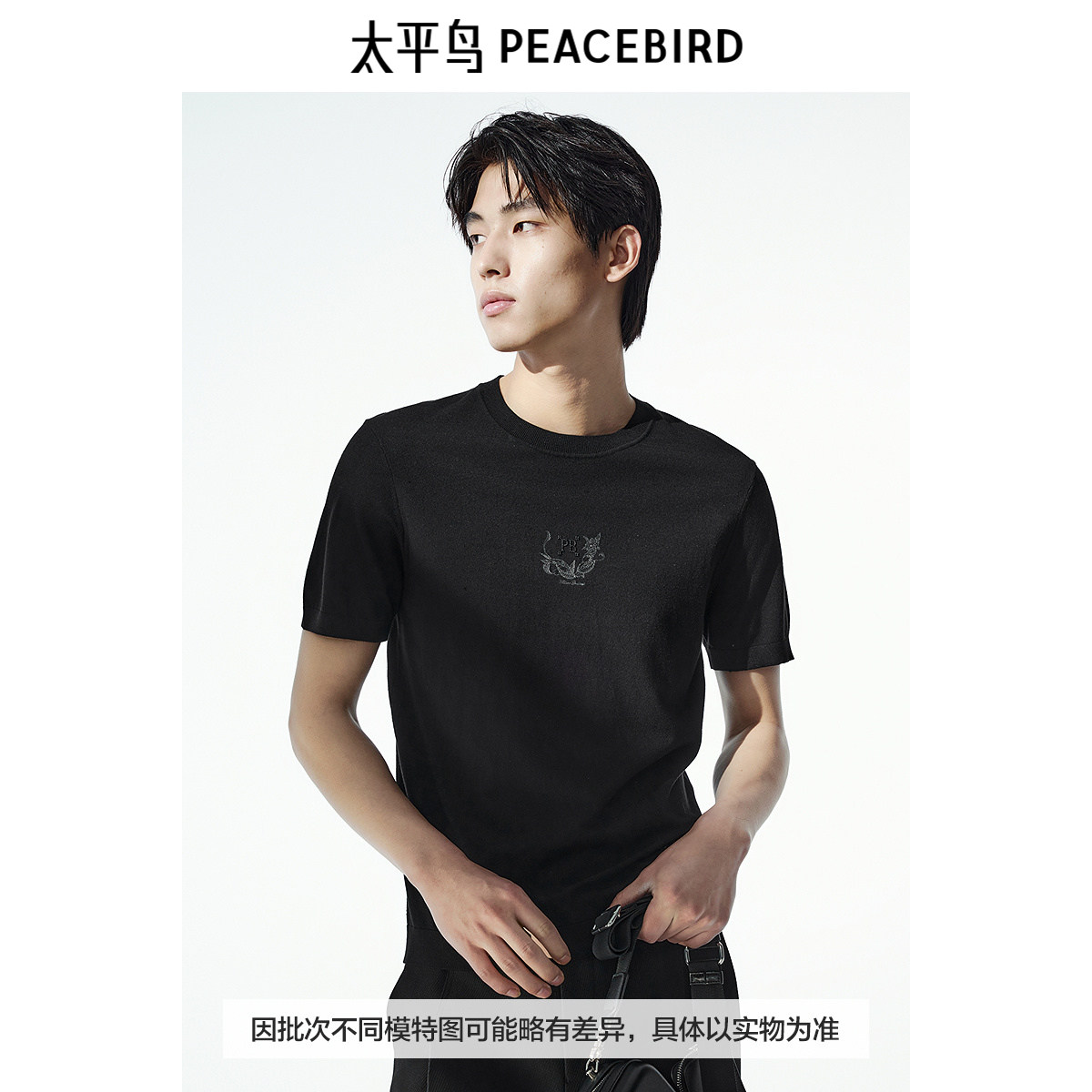 太平鸟男装黑色短袖T恤秋季修身刺绣时尚青年休闲短袖潮牌