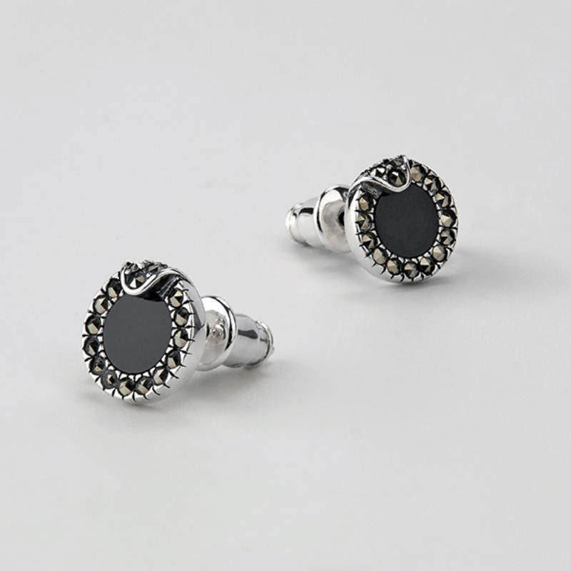 曼古银多瑙河黑玛瑙宝石耳钉S925纯银女士新年礼物时尚百搭耳饰