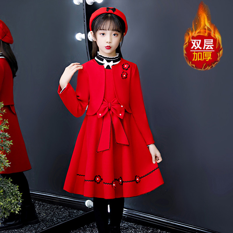 [抗起球]女童加绒连衣裙儿童薄绒裙子冬季宝宝红色公主裙礼服秋冬