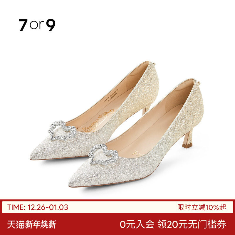 7or9法式婚鞋女水晶高跟鞋尖头细跟秀禾婚纱新娘浅口单鞋流金香槟