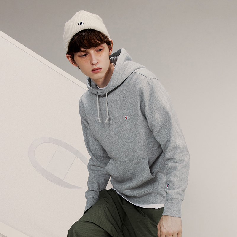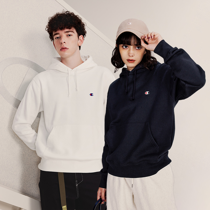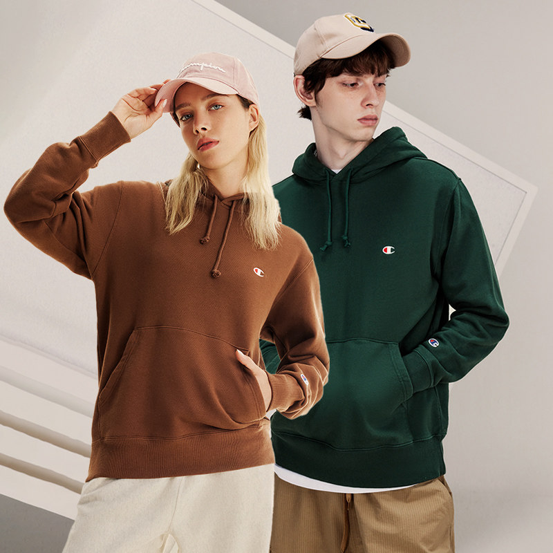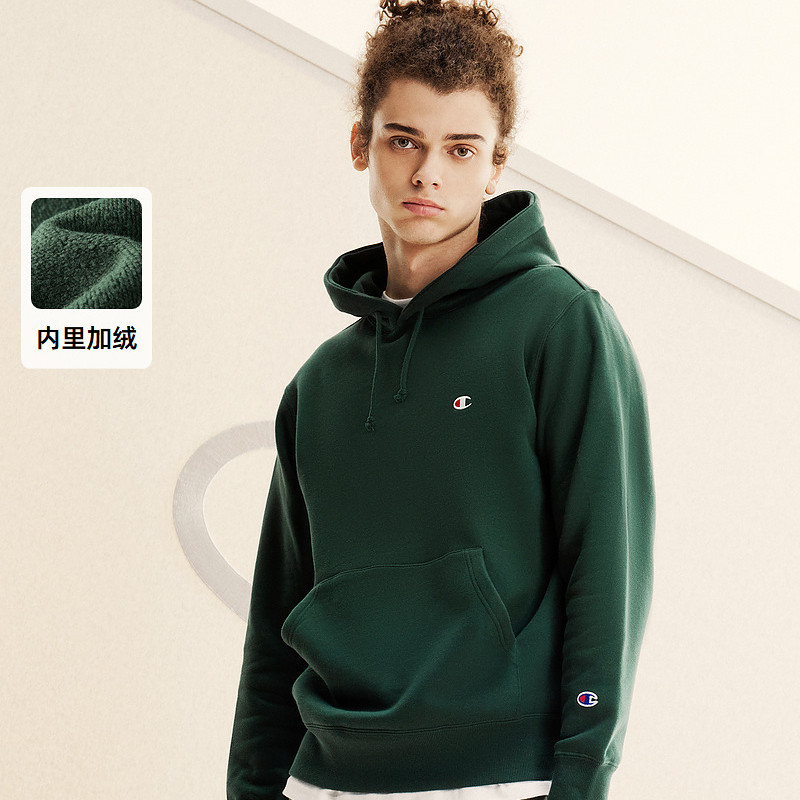 Champion冠军加绒卫衣男秋冬连帽加厚女刺绣潮牌套头上衣红色潮牌