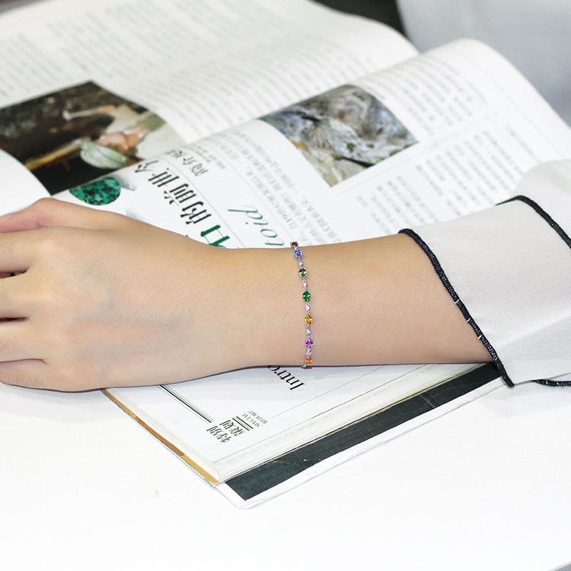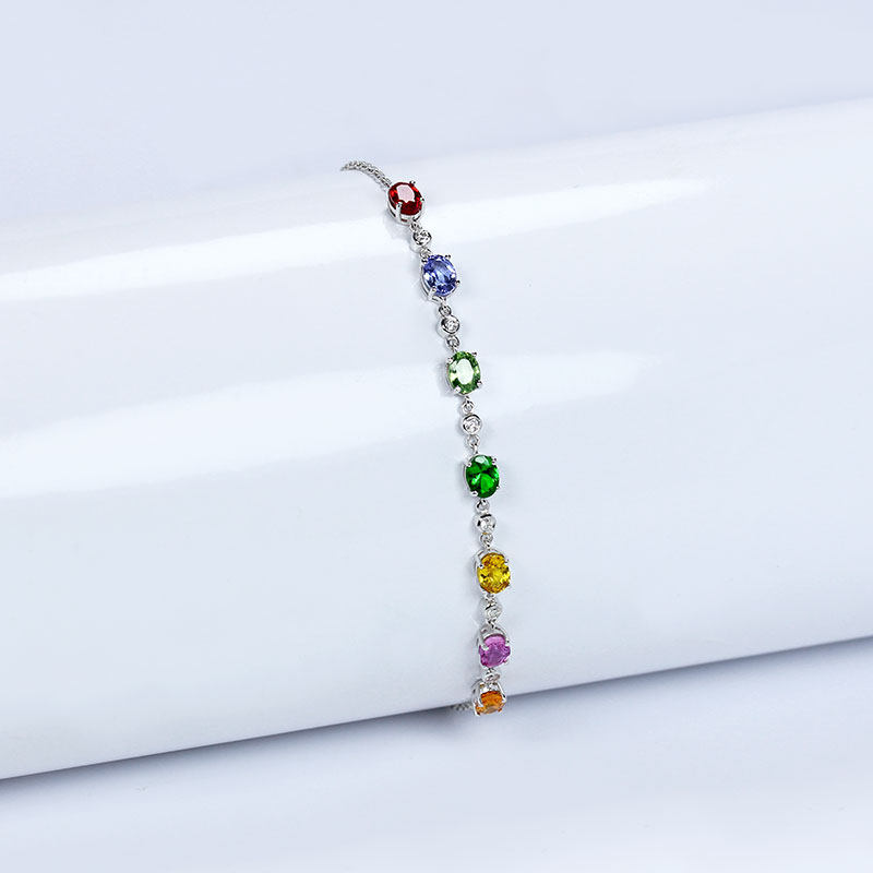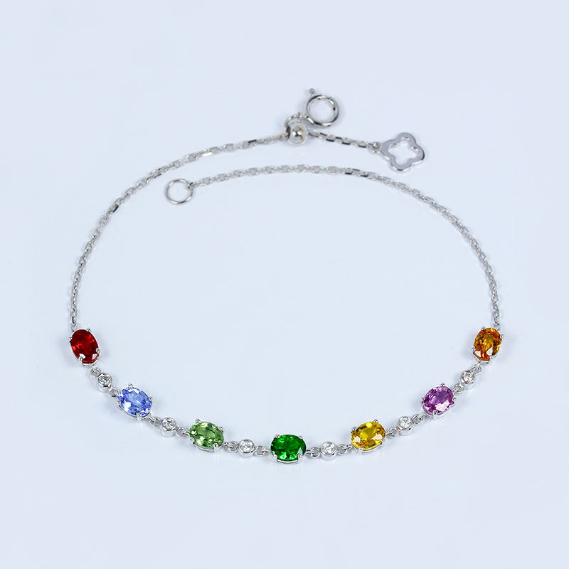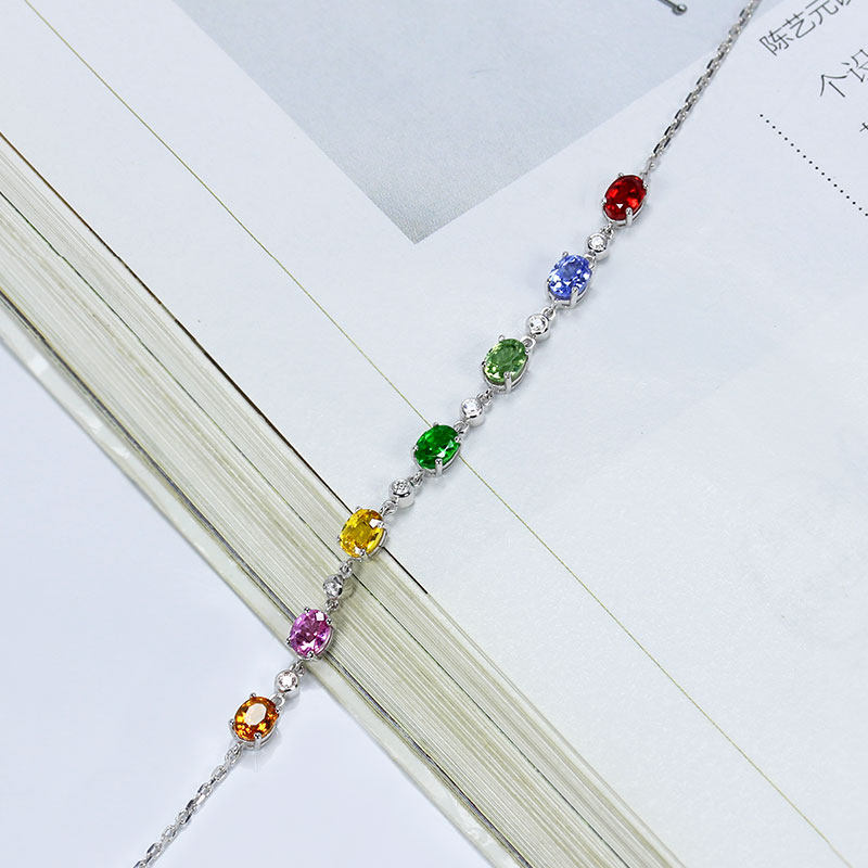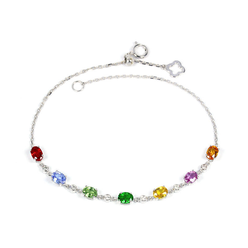 18K白金天然渐变多彩蓝宝石手链 明艳彩虹色镶钻石黄金可调节女款