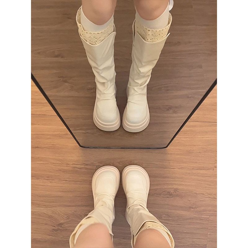 白色复古英伦风增高厚底靴子女长筒靴2025新款秋冬配裙子骑士长靴