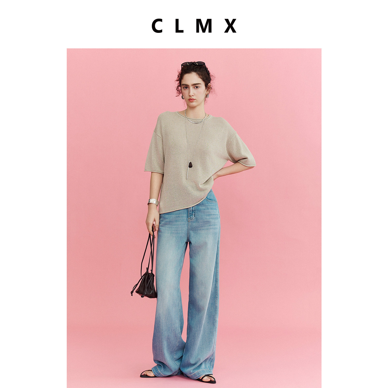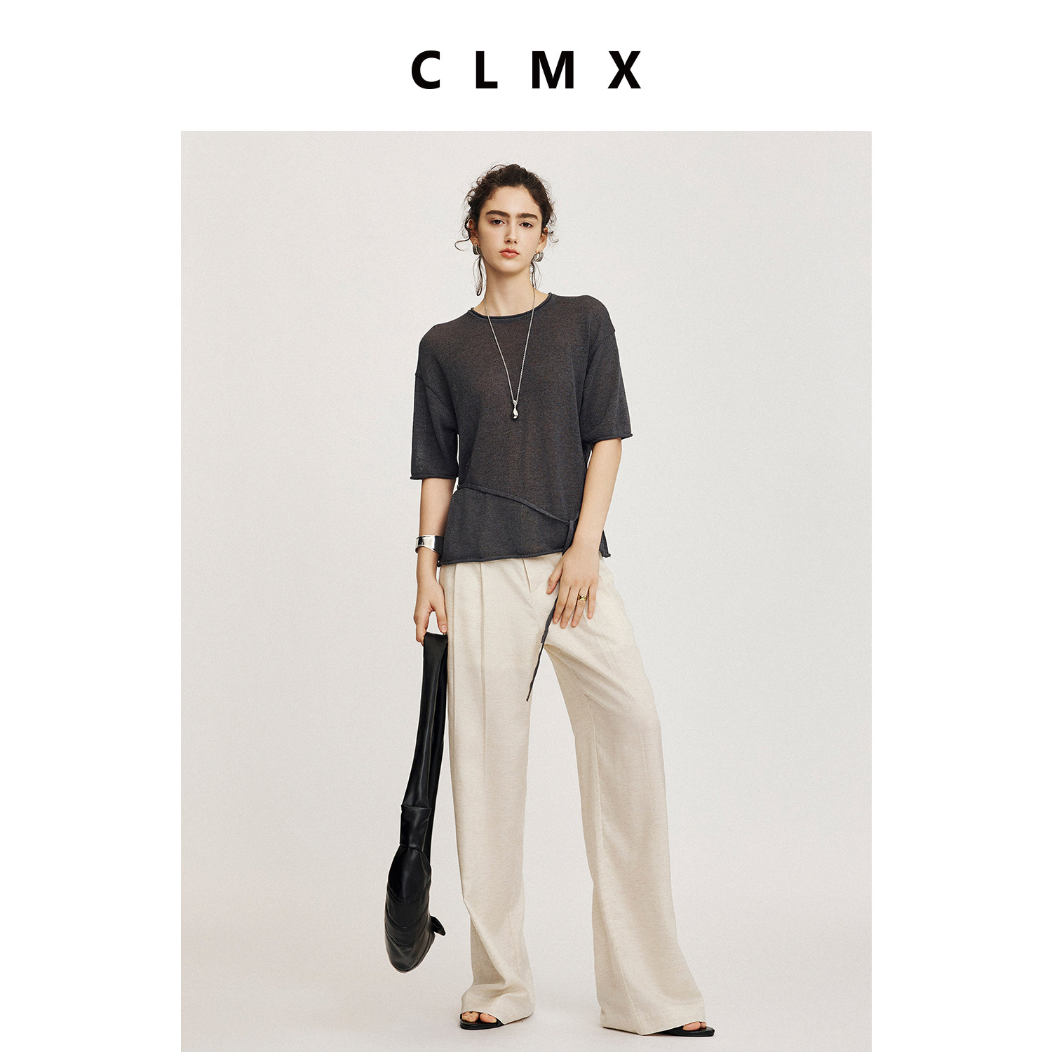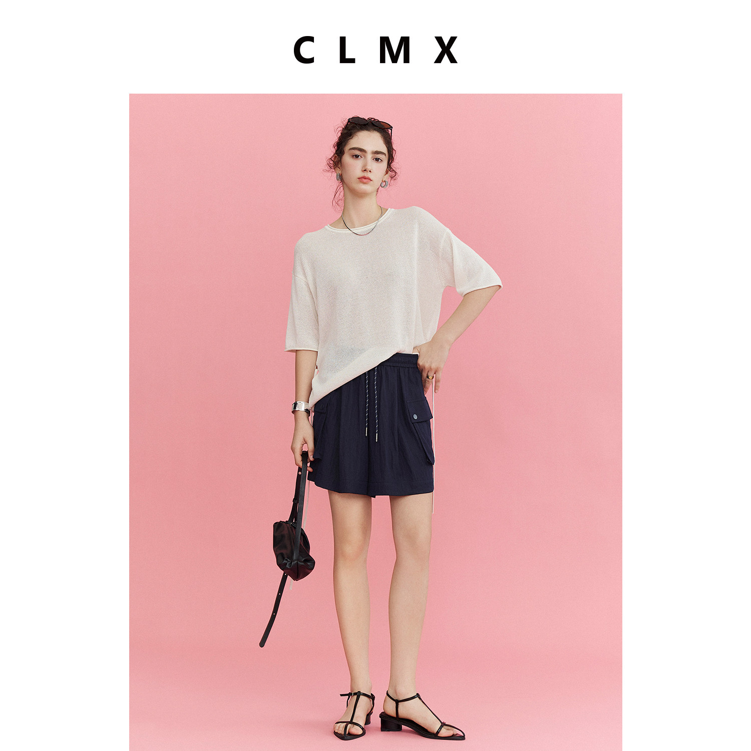 CLMX纯色简约圆领上衣透气和纸桑蚕丝莱赛尔纱系带针织短袖女