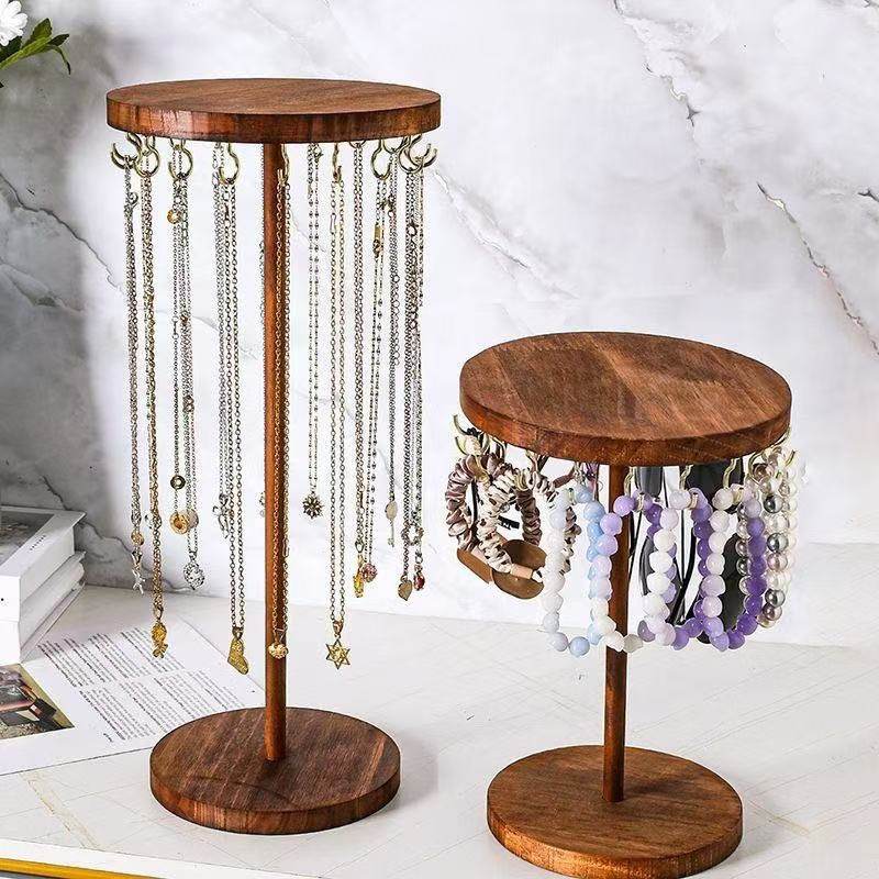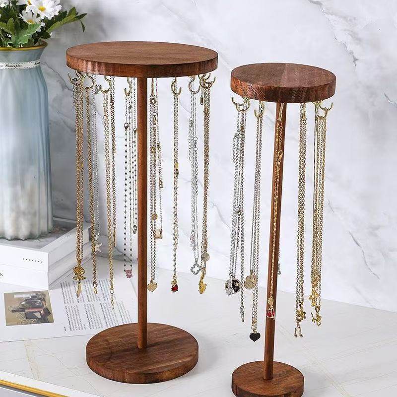 胡桃色实木圆盘挂钩项链展示架子摆摊饰品毛笔架可拆首饰收纳架