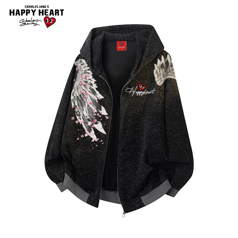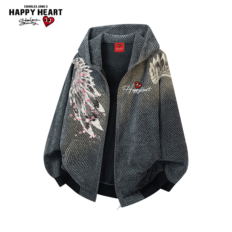 查尔斯桃心美式翅膀印花香风条纹连帽开衫卫衣男秋季宽松休闲外套
