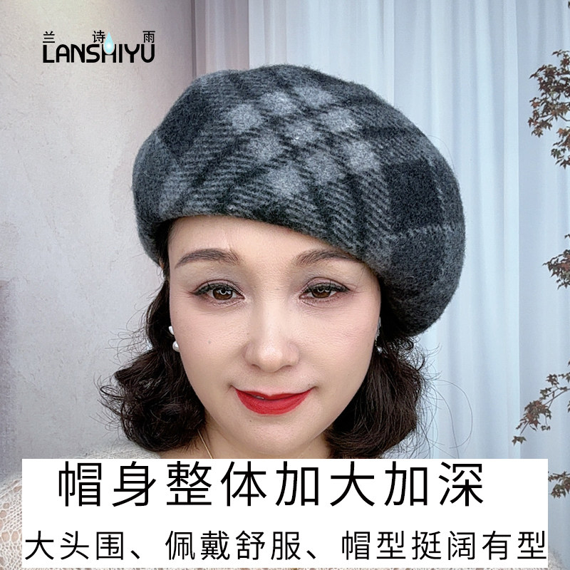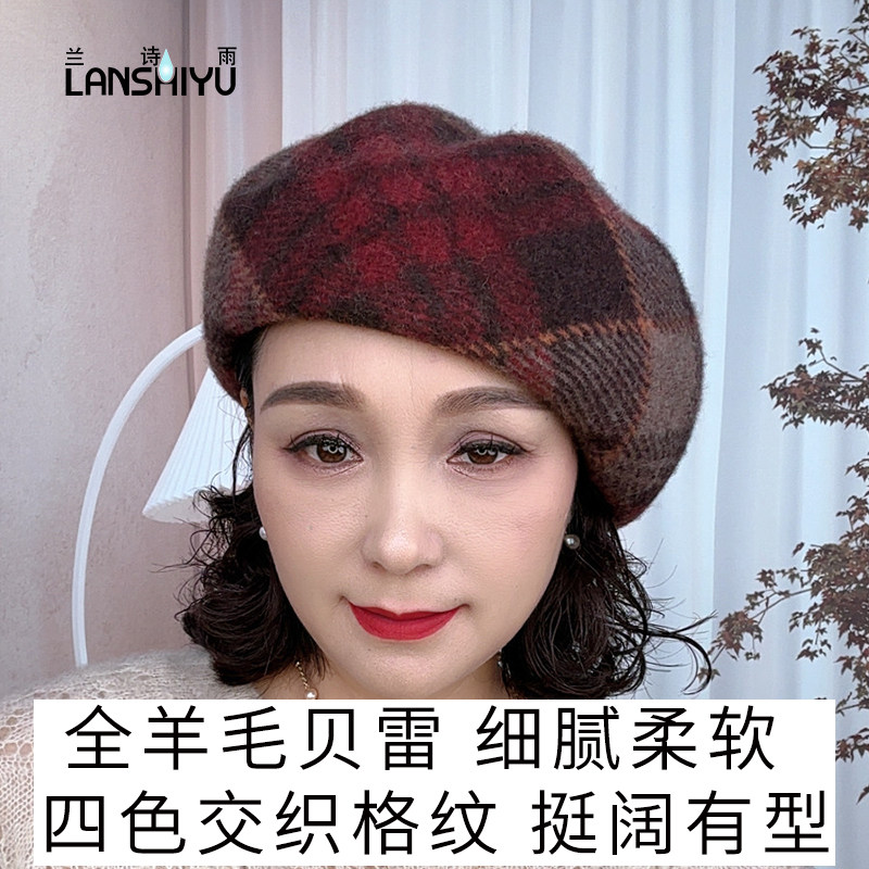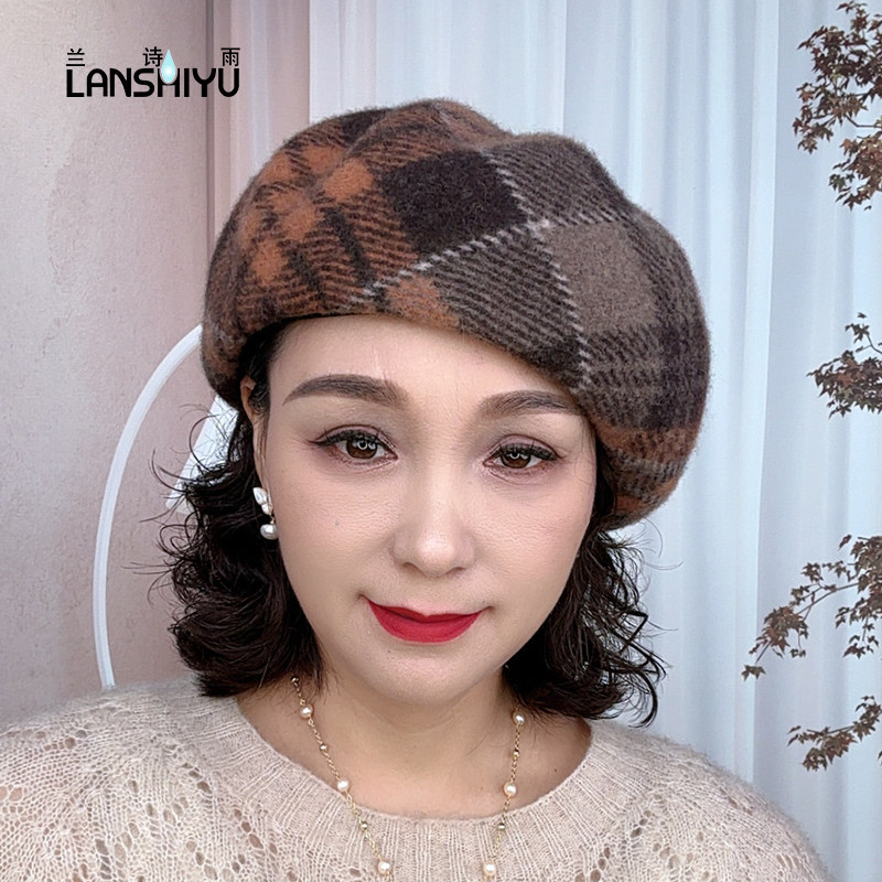 兰诗雨秋冬新款羊毛帽子女经英伦格子南瓜帽御寒显脸小休闲贝雷帽