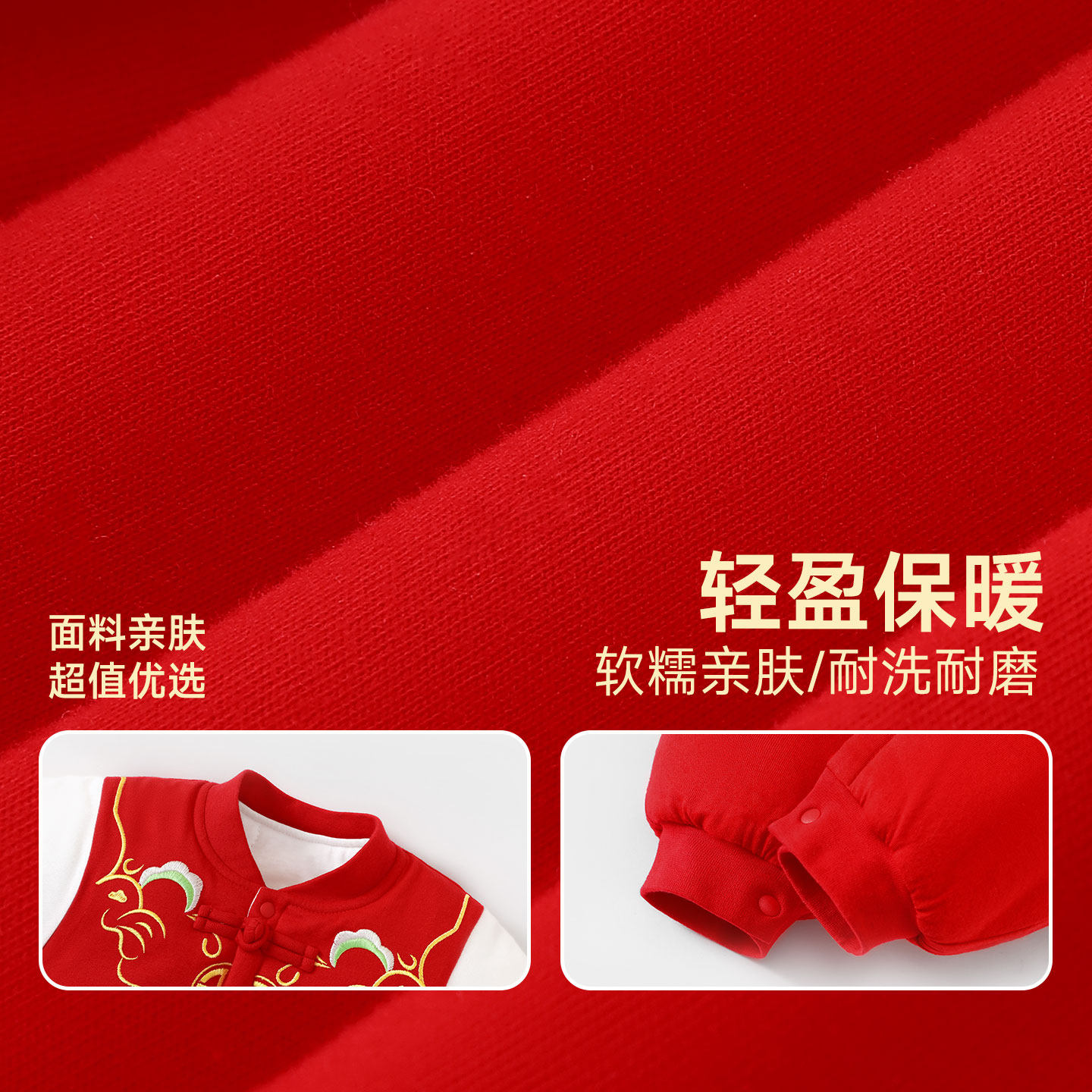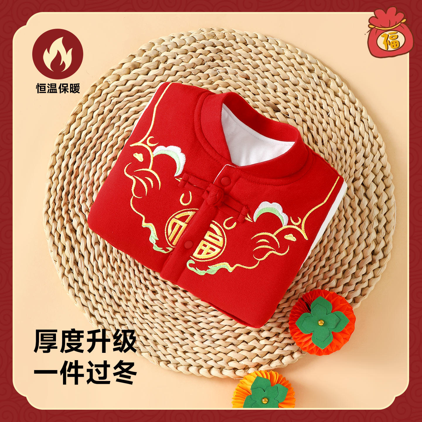 婧麒婴儿秋冬季连体衣夹棉加厚新生儿满月拜年服新年喜庆刺绣哈衣