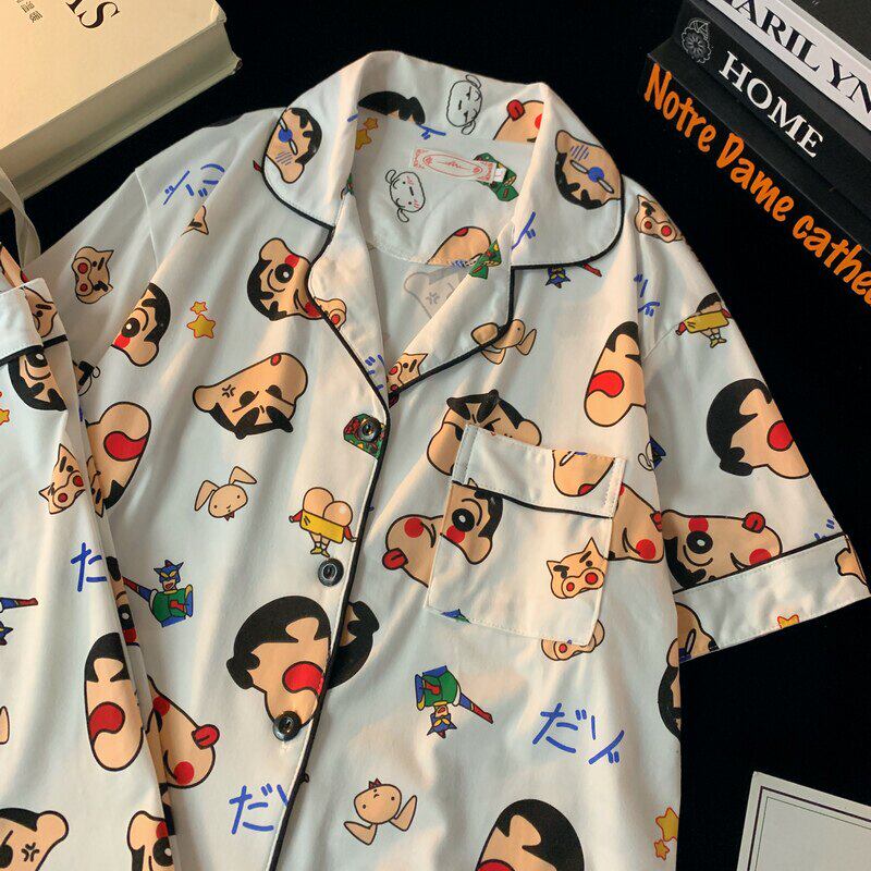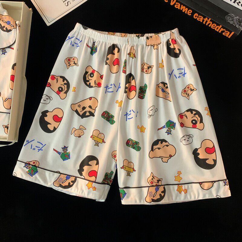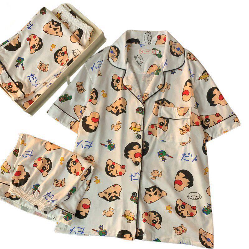 红豆情侣睡衣日系卡通蜡笔小新春夏季纯棉短袖短裤宽松家居服三件