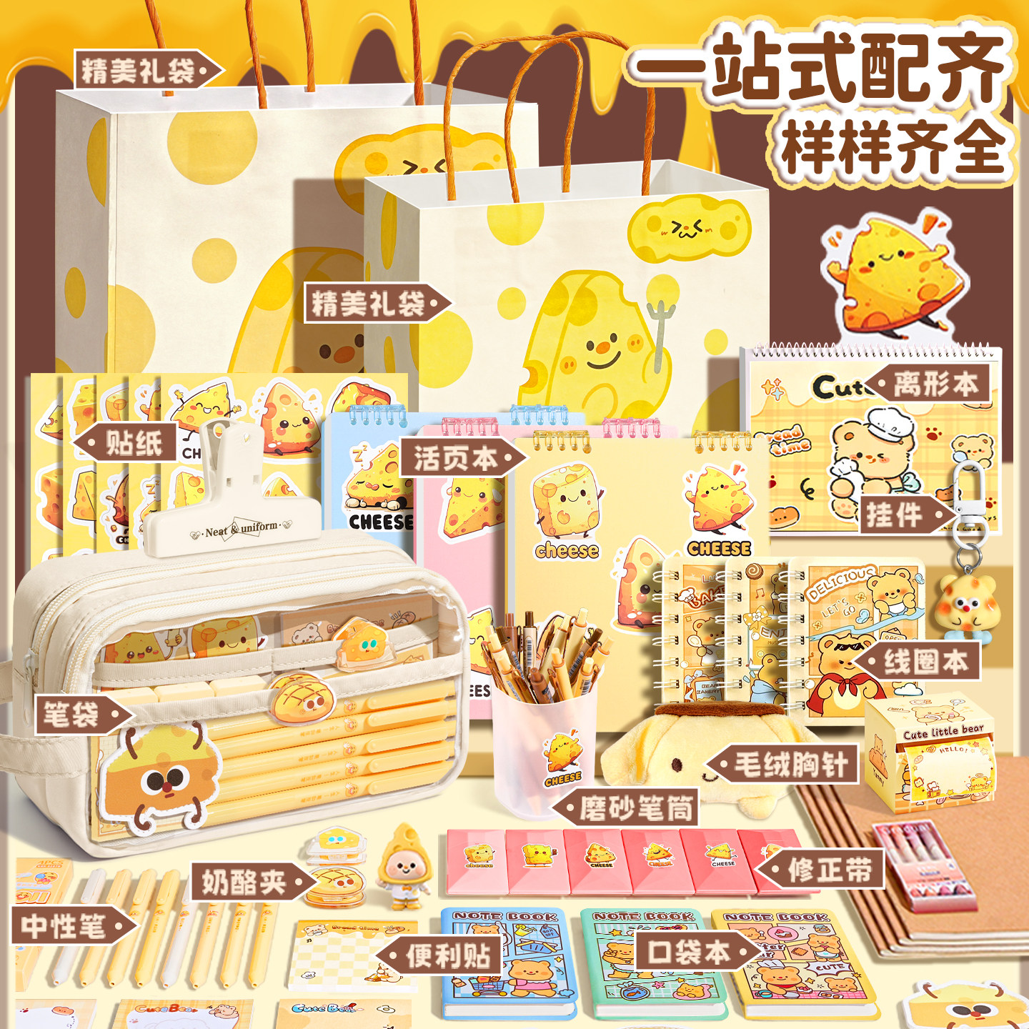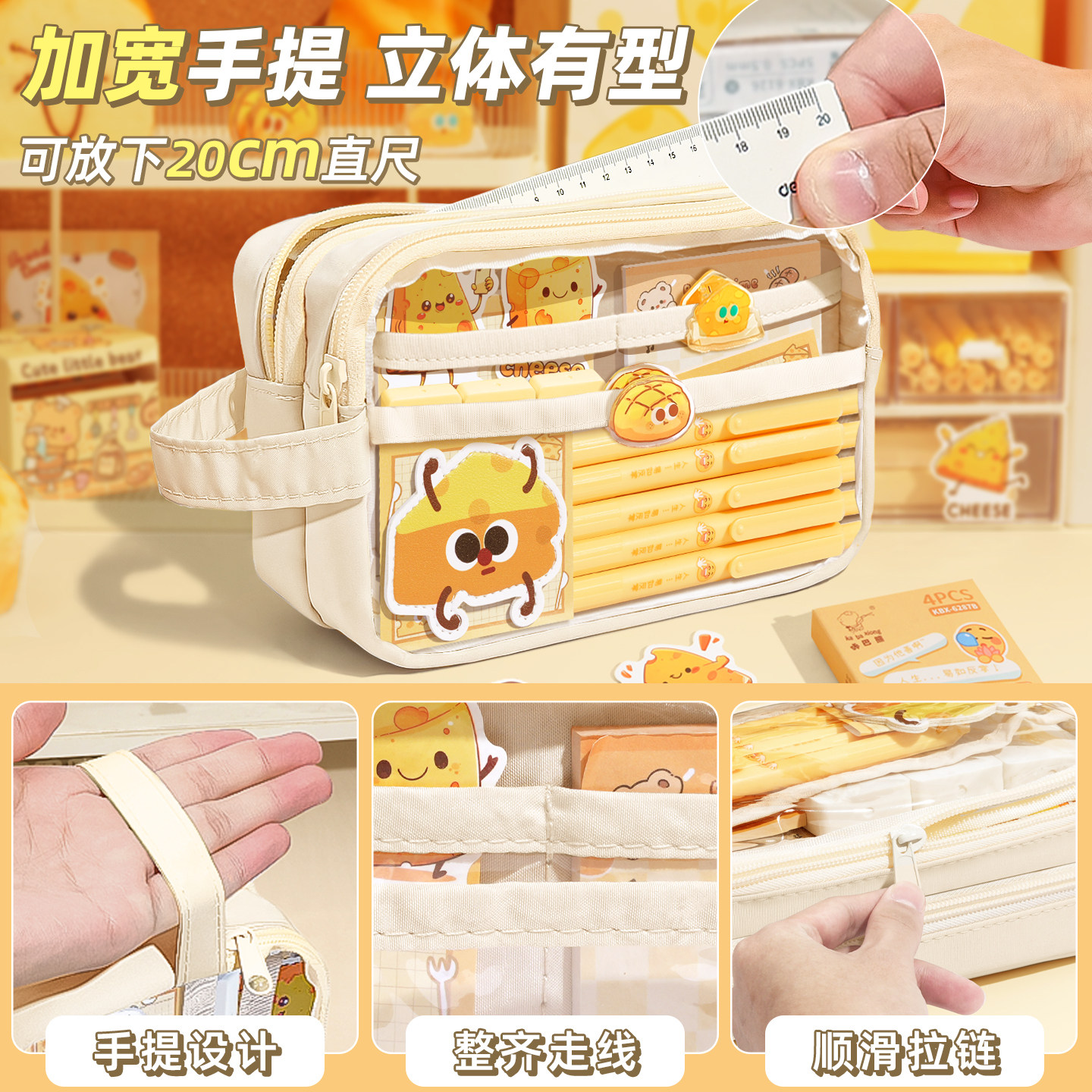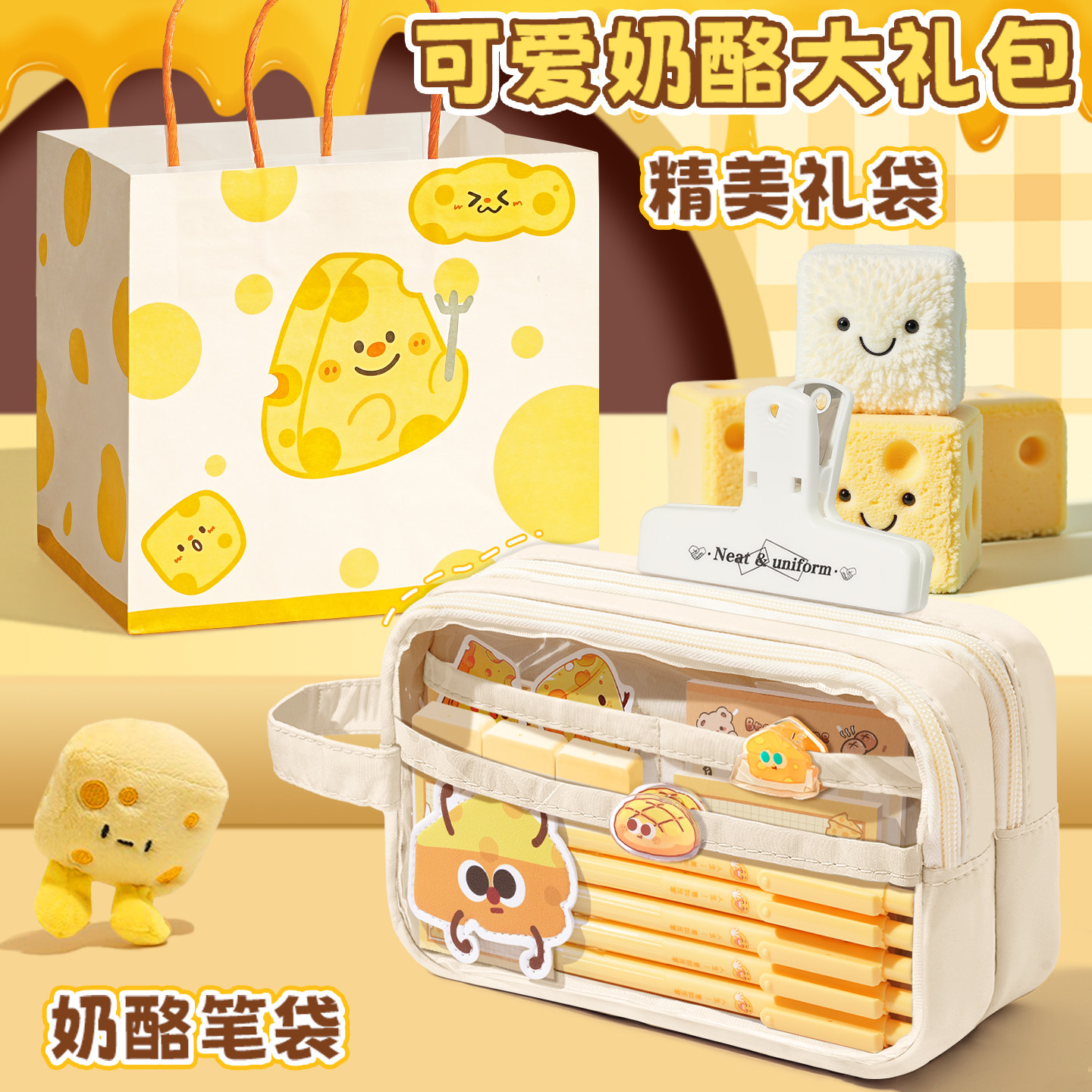 奶酪全套装~大容量笔袋女生2026超火新款铅笔盒高颜值ins风文具盒女孩款小学生儿童痛包初中男生简约套装透明