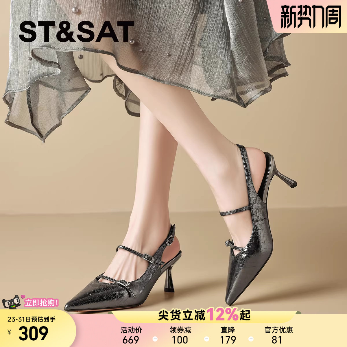 星期六气质细跟高跟鞋女2025夏季新款性感包头凉鞋真皮尖头一字带