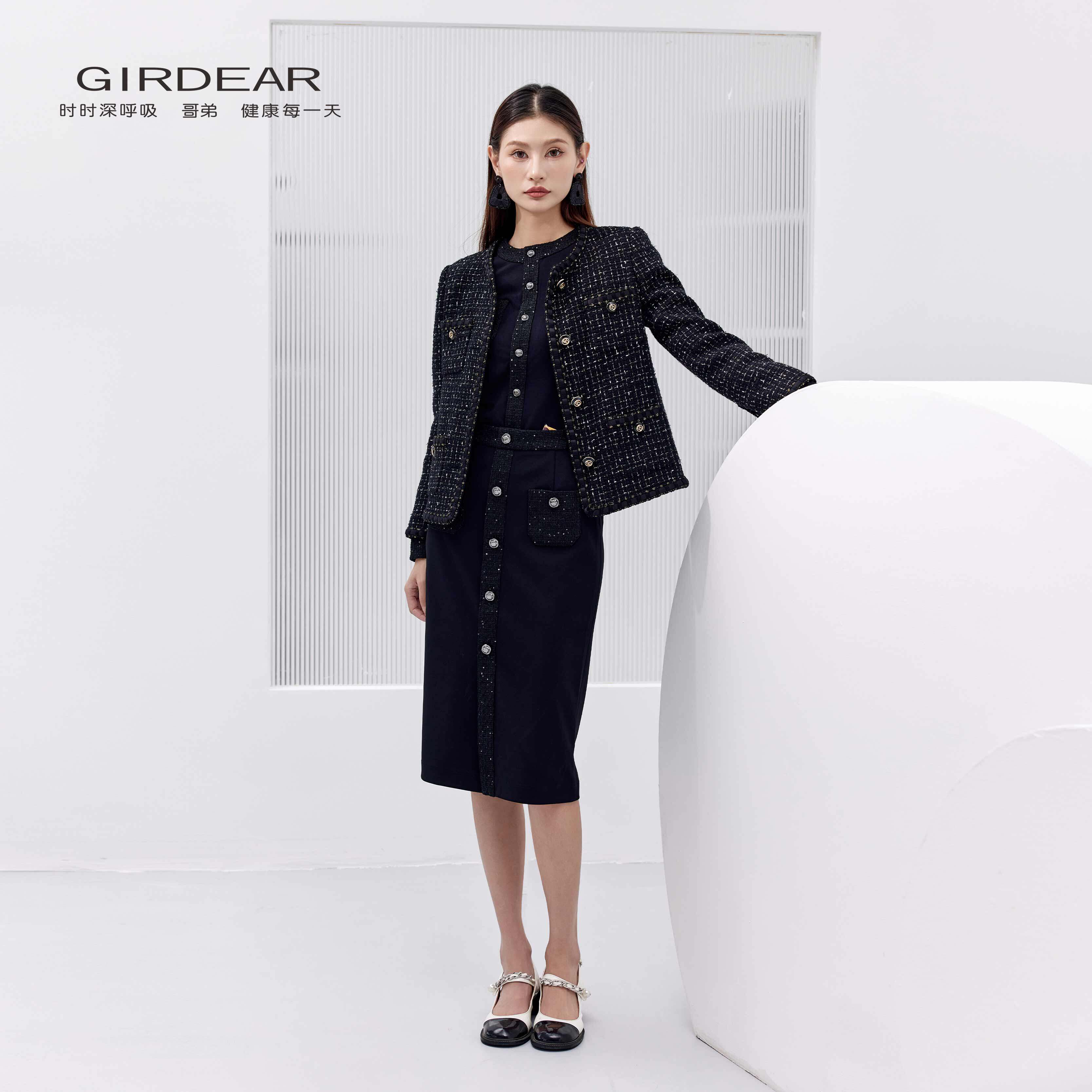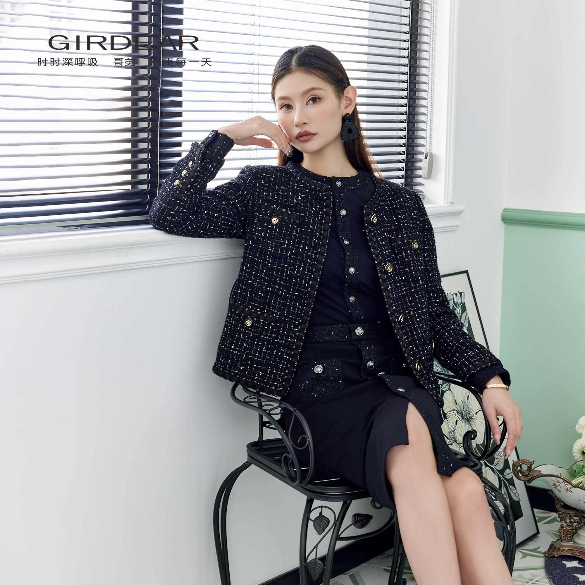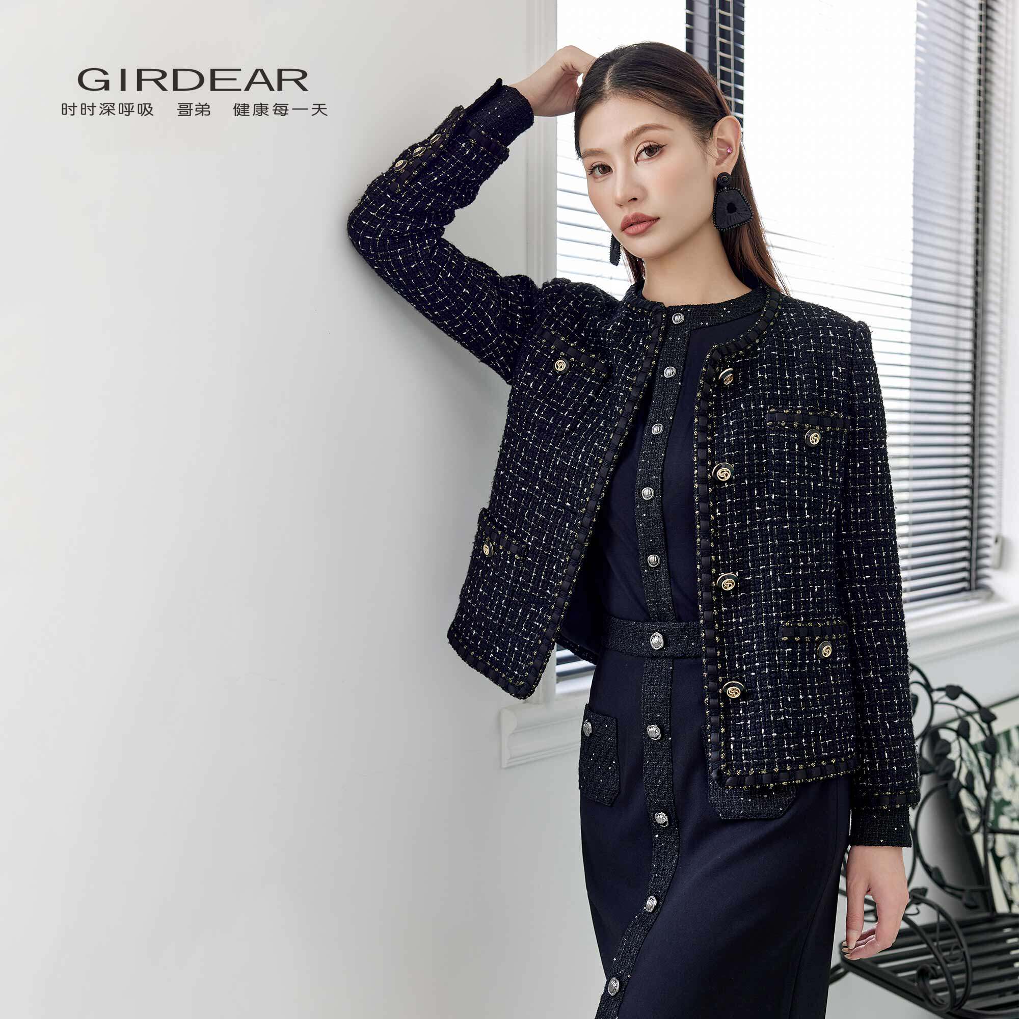 Girdear/哥弟小香风外套【含绵羊毛】粗花呢圆领黑金气质1400042