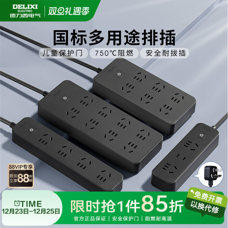 德力西官方插座黑色插排插线板排插面板多孔家用拖线板多功能插板