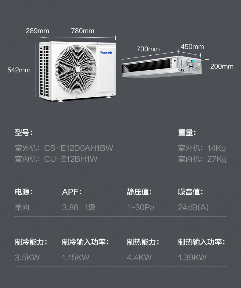 松下中央空调家用带空净直流变频冷暖风管机1.5匹一级E12D0AH1BW