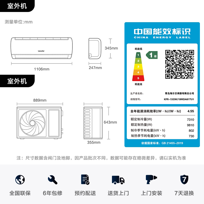 【纯铜管】海尔空调1.5匹1匹家用一级变频冷暖挂机净省电E1旗舰店