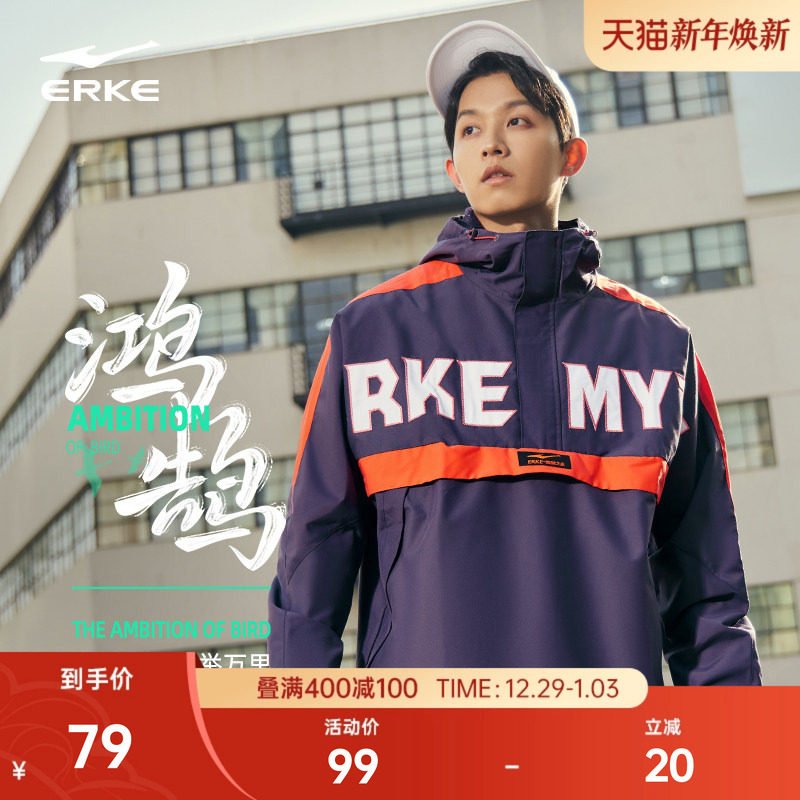 鸿鹄丨鸿星尔克外套男冬季男士国潮运动防风衣男款连帽半开襟上衣