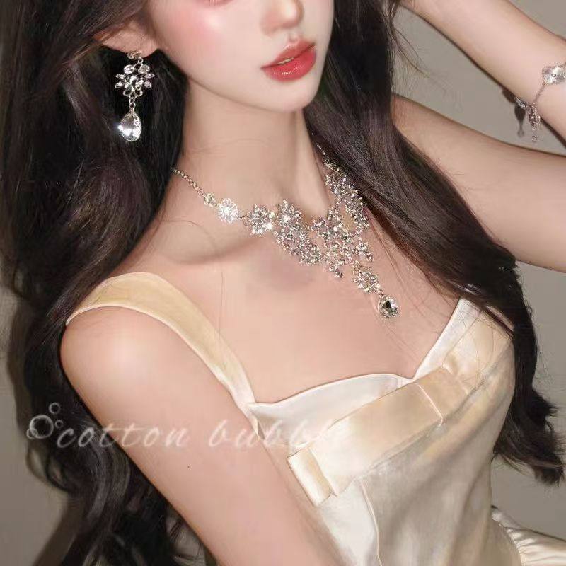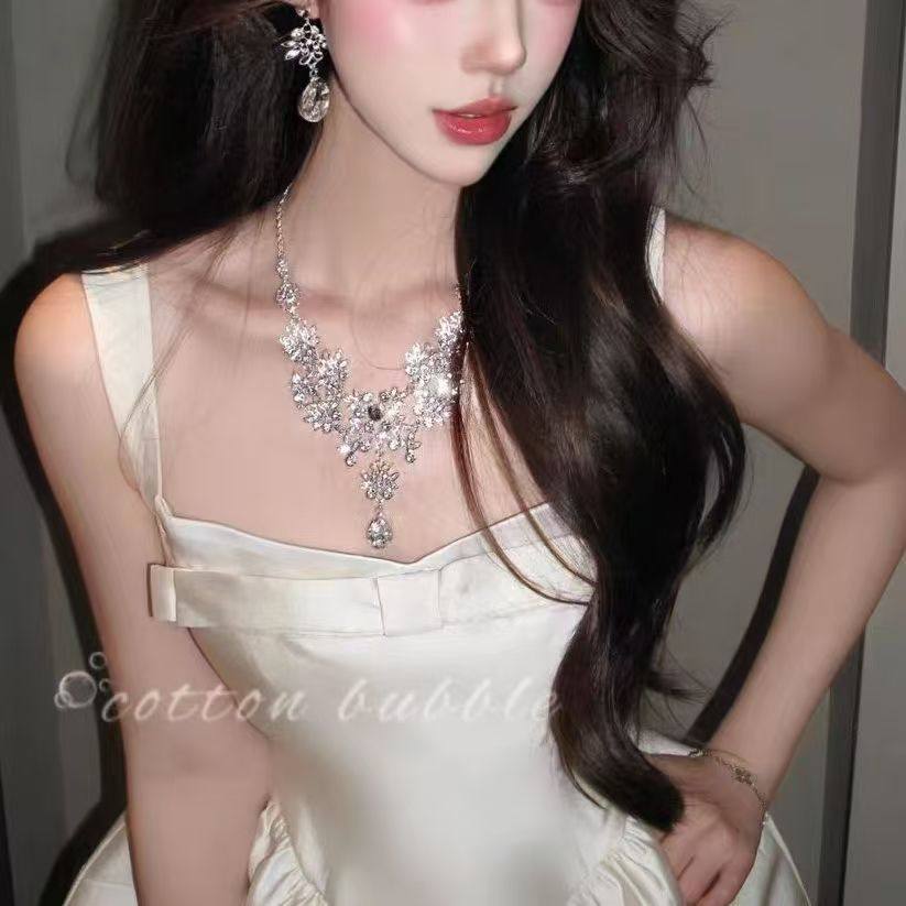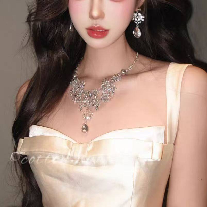 轻奢重工银色花朵项链耳环套装2025新款女新娘礼服配饰夸张锁骨链