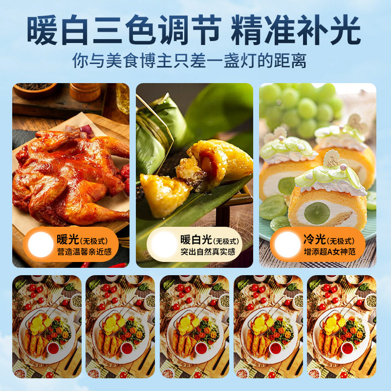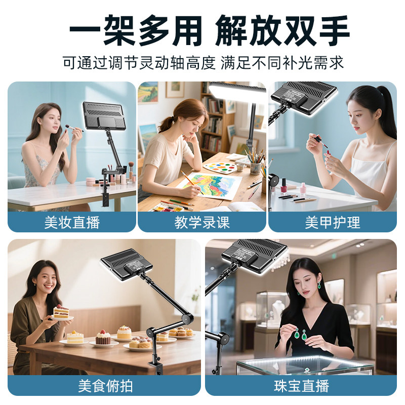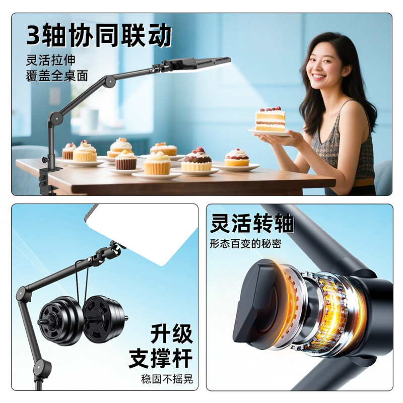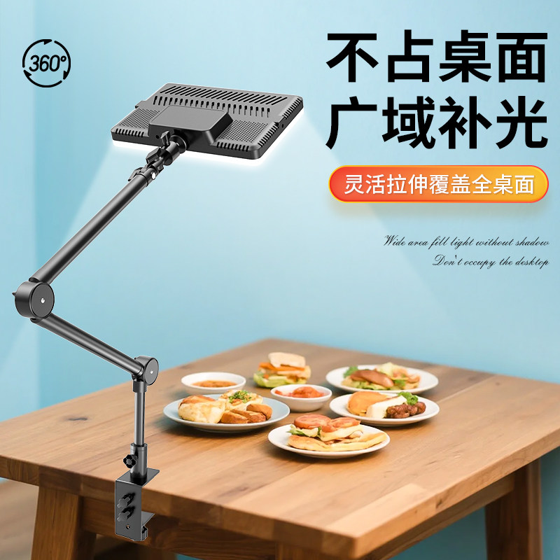 美食直播补光灯拍摄专用桌面落地折叠悬臂杆俯拍架厨房食物菜品珠宝静物拍照方形柔光平板打光灯万向补光支架
