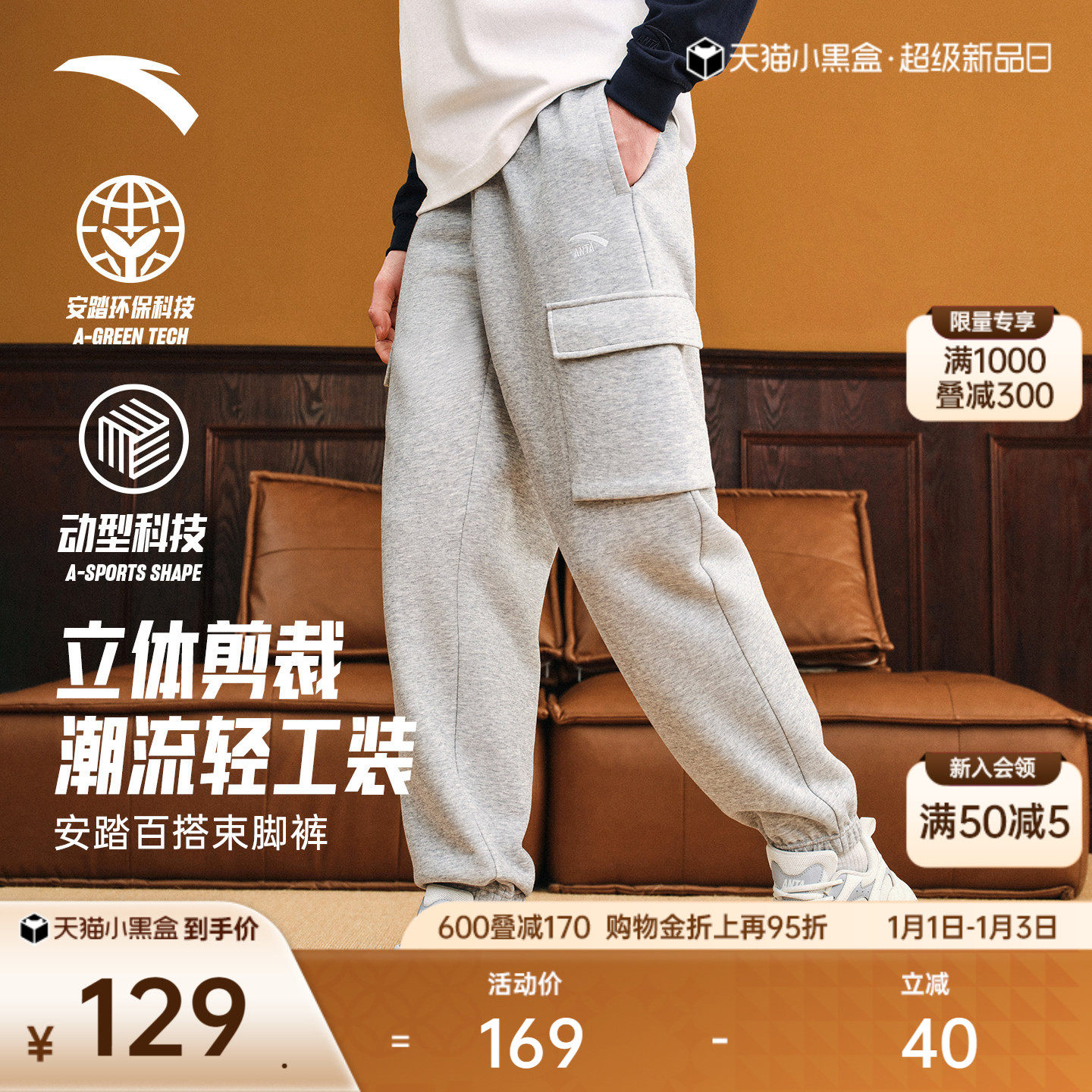 安踏美式轻工装运动长裤男士2025新款潮流束脚裤透气休闲裤卫裤子