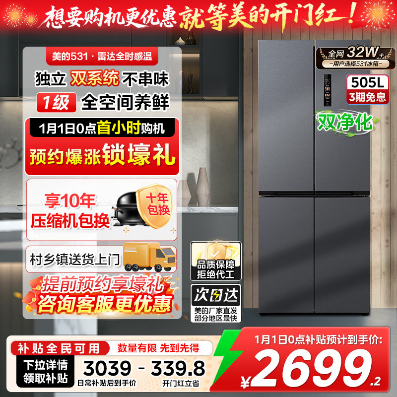【以旧换新补贴】美的冰箱531十字门电冰箱大容量一级能效家用