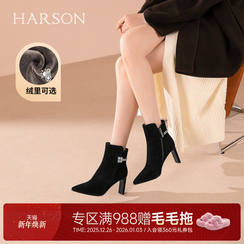 哈森气质尖头高跟水钻时装靴加绒保暖女短靴2025冬新款HA259902