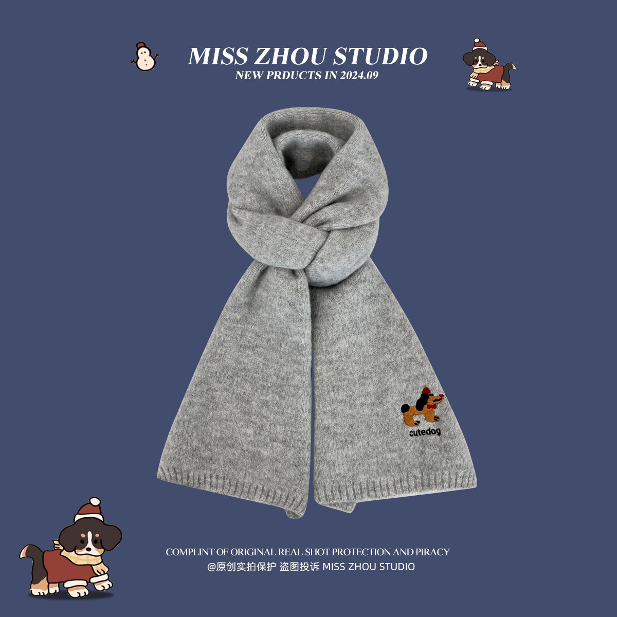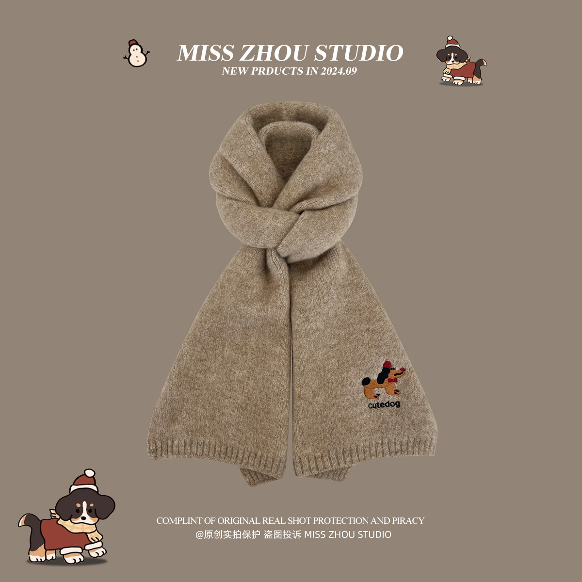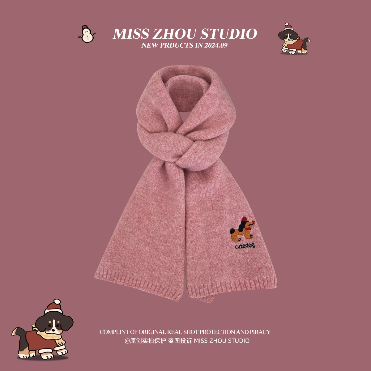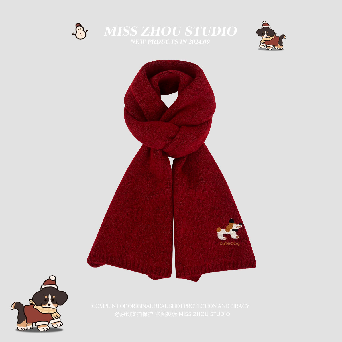 可爱刺绣针织围巾秋冬保暖时尚百搭高级感围脖学生红色灰色绿色