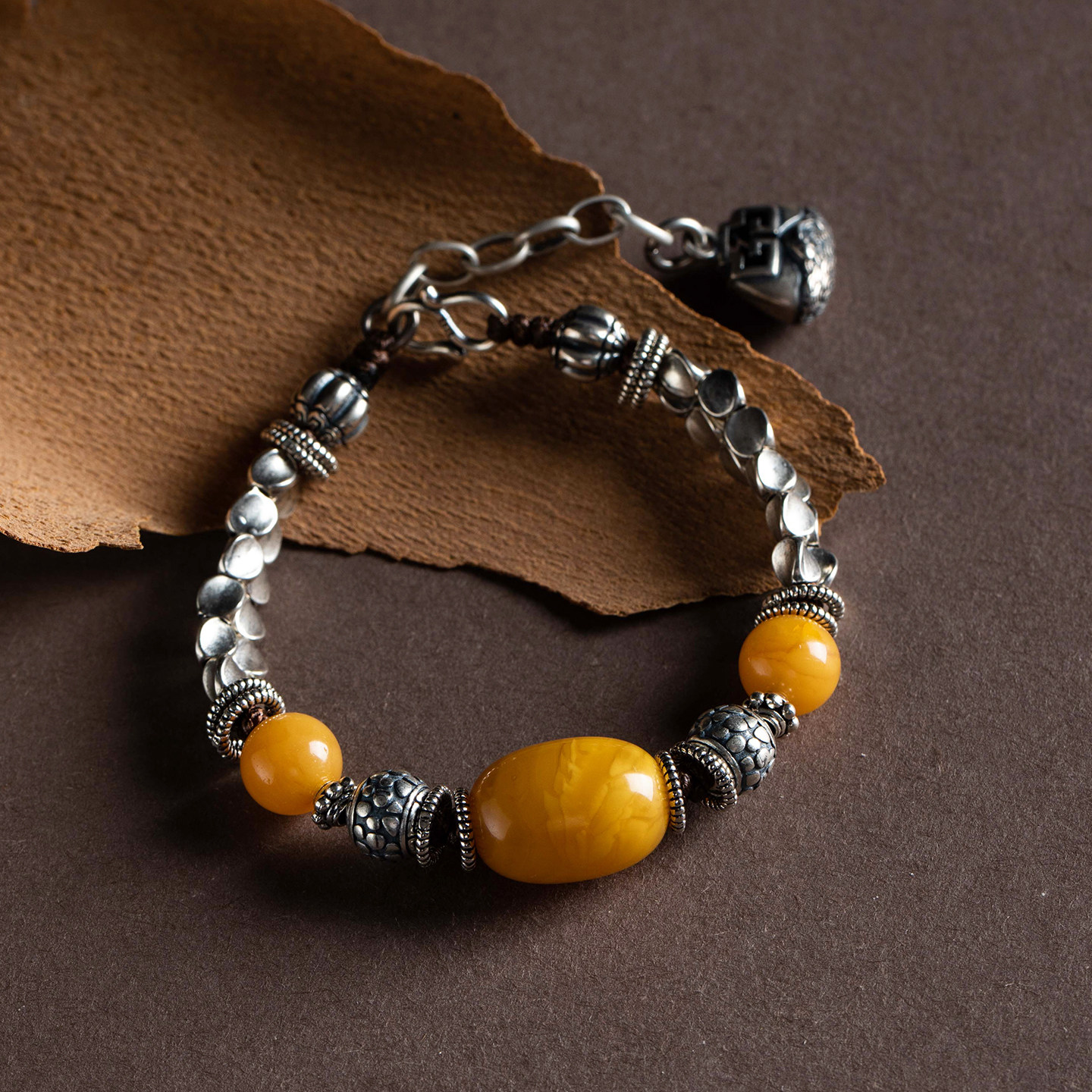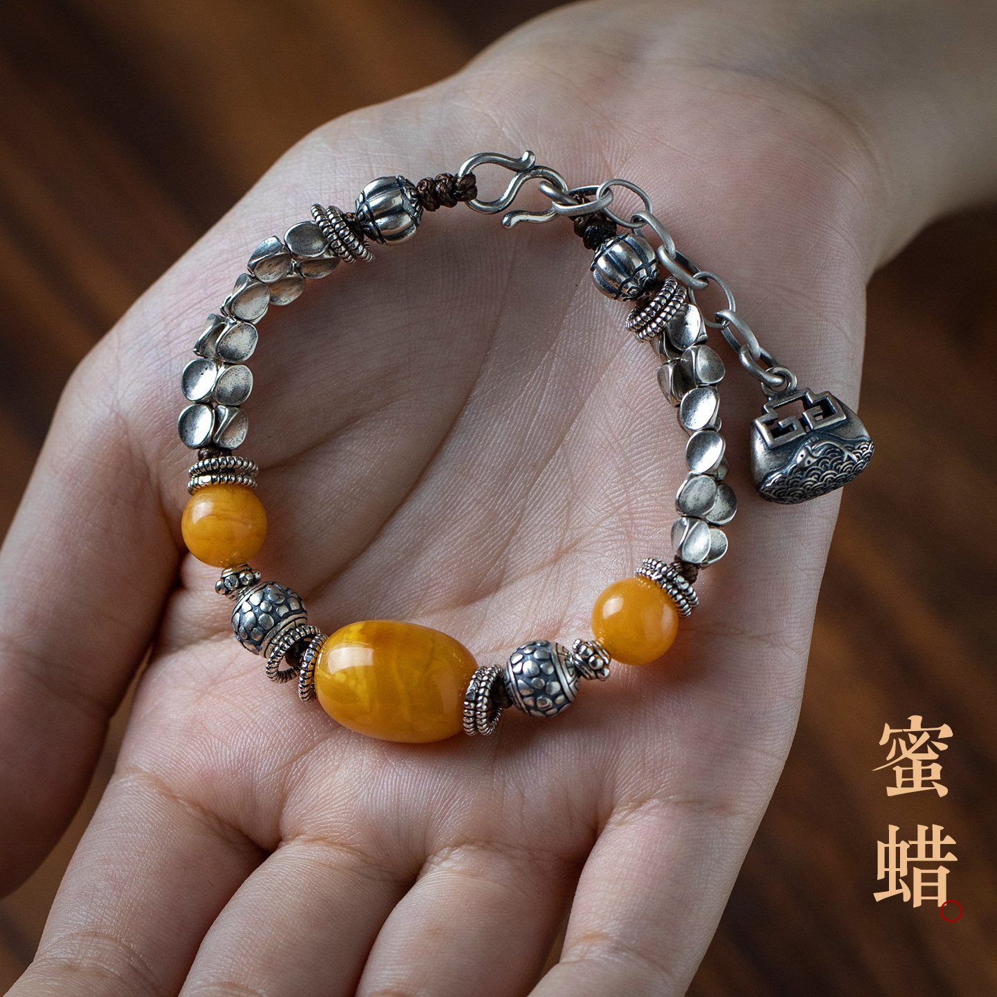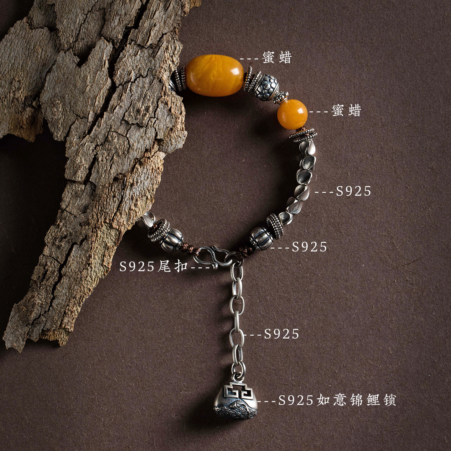 【设计师款】天然琥珀蜜蜡手链女纯银如意锦鲤锁手饰送男友礼情侣