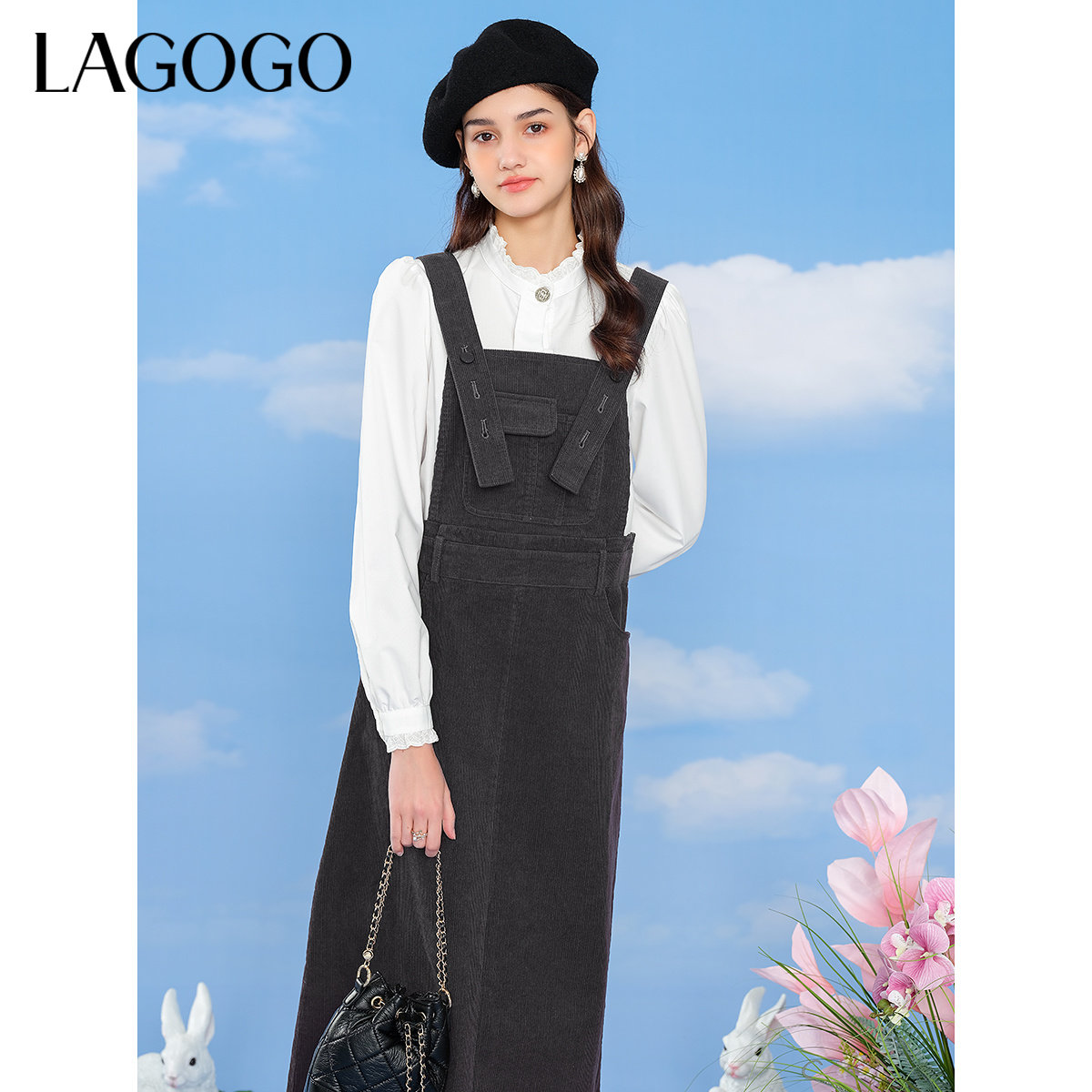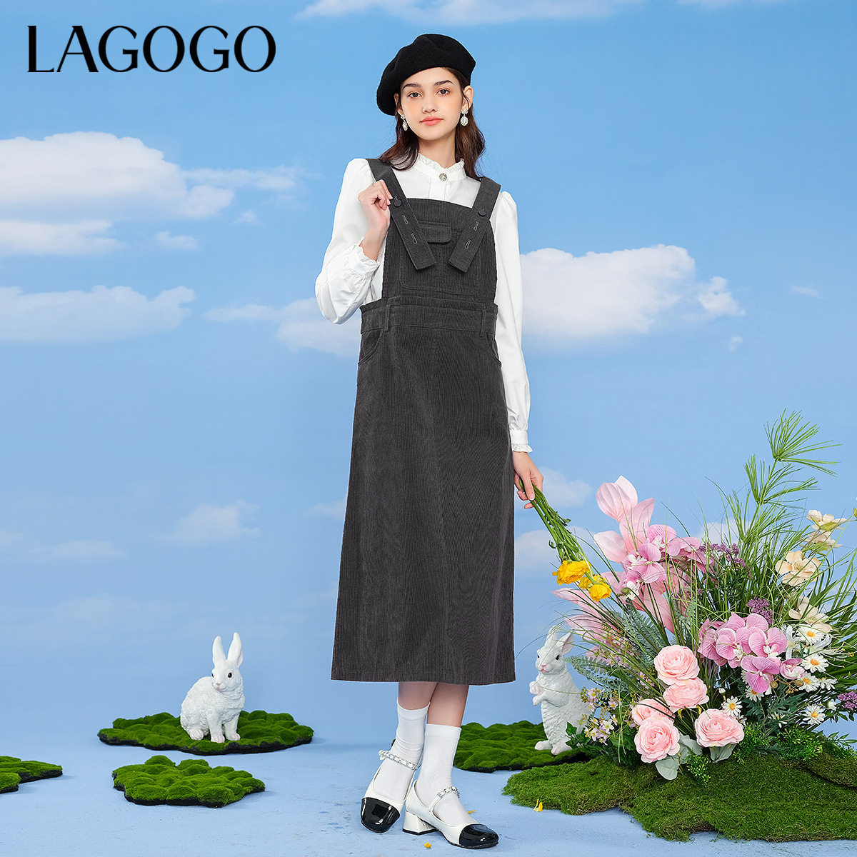 LAGOGO复古灯芯绒背带裙拉谷谷春秋新款灰色格雷系穿搭连衣裙