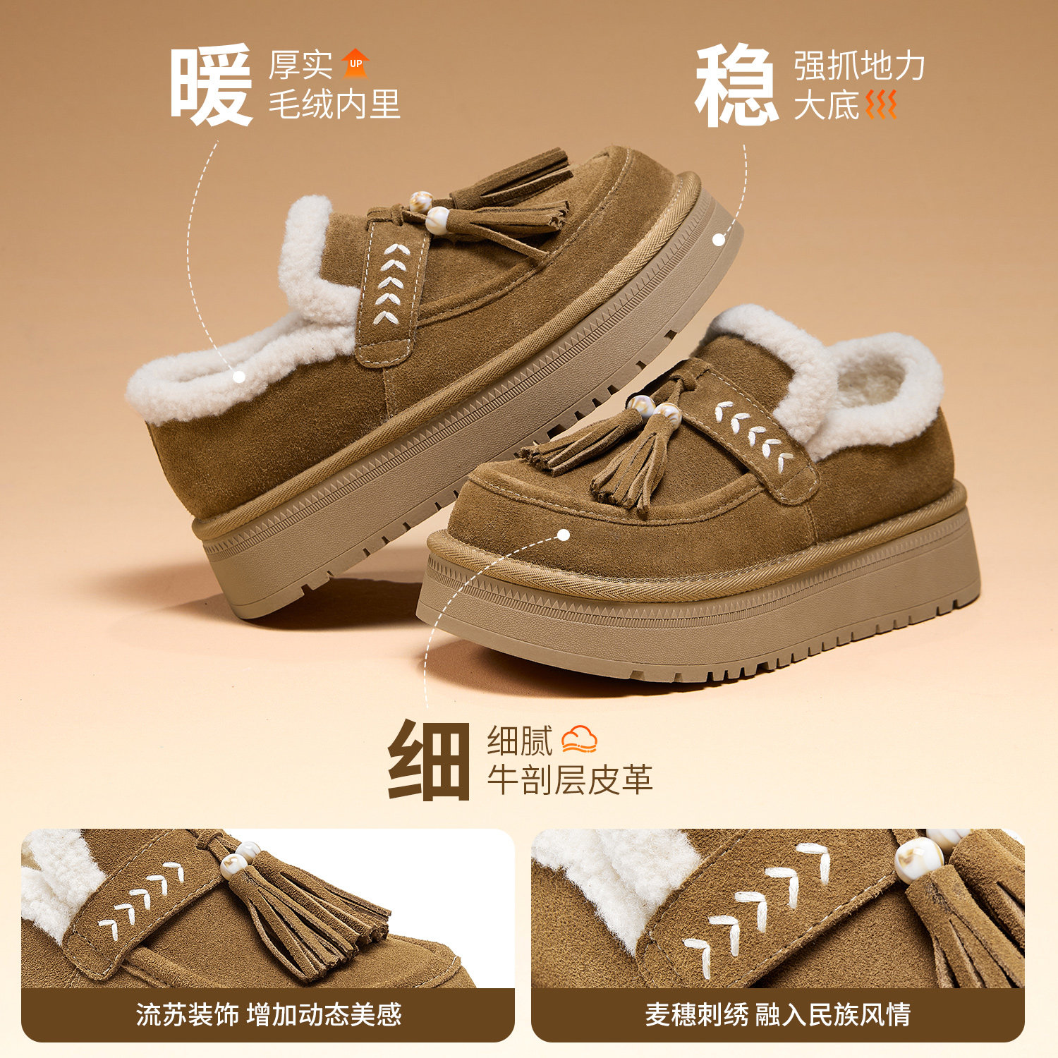 内增高~桑坡真皮厚底羊毛雪地靴女加绒保暖东北棉靴秋冬季短筒靴