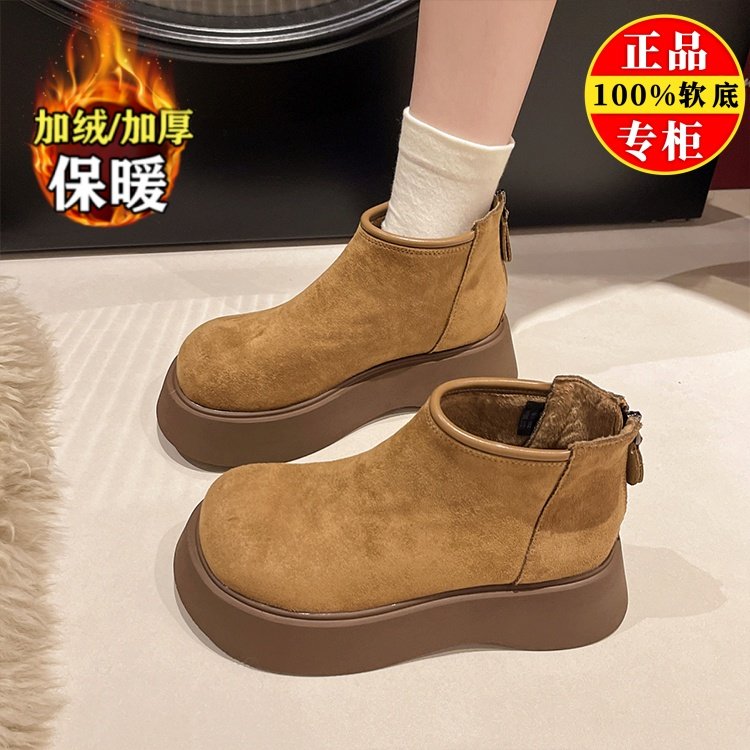 miu家厚底雪地靴女冬季真皮短靴羊毛侧拉链增高厚底加绒毛毛棉鞋