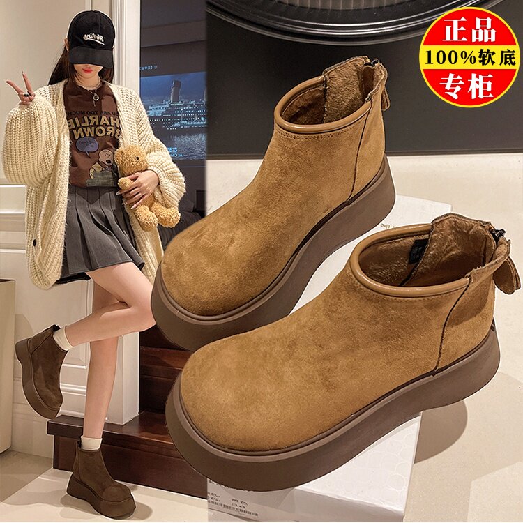 品牌真皮雪地靴女秋冬季2024新款短靴复古厚底增高马丁靴加绒棉鞋