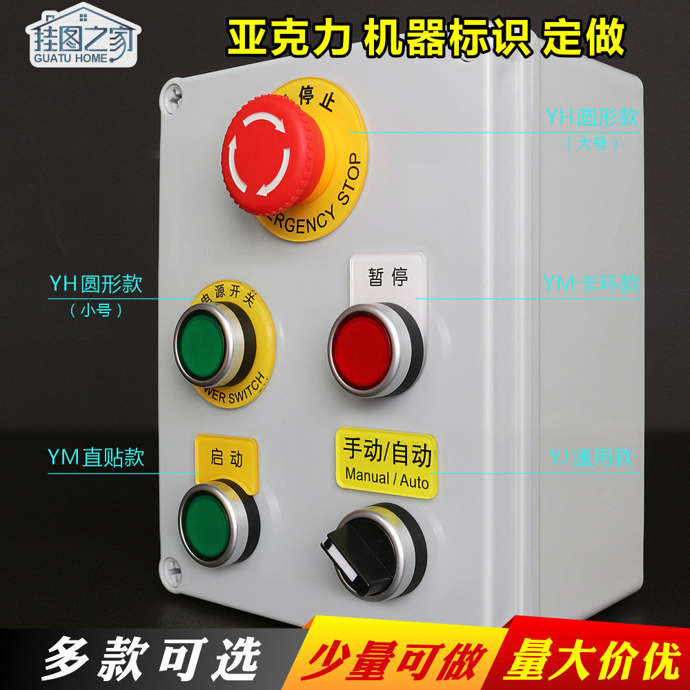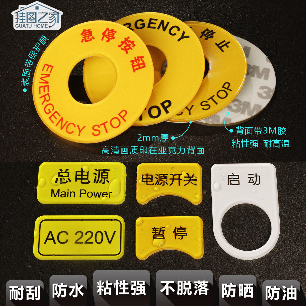 亚克力按钮标识定做3M胶透明有机板机器设备标签标牌订做紧急停止