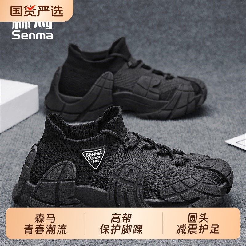 森马男鞋夏季透气网面飞织网鞋男士防滑厚底运动黑色休闲袜子潮鞋